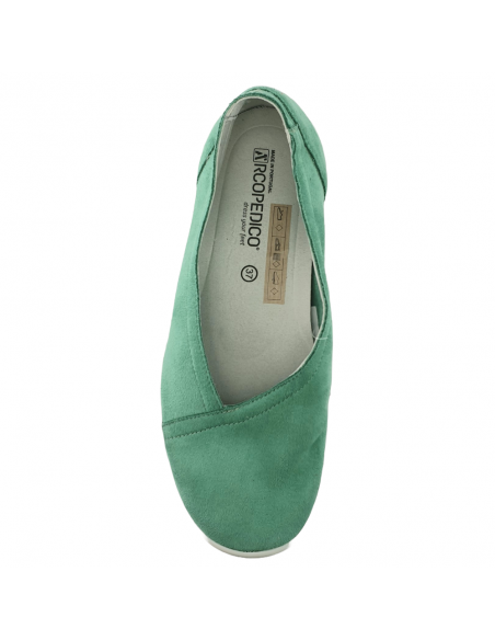 Descripción: Bailarina mujer Arcopedico GOREME de licra LAYTECH verde, elástica para mejor adaptación a tu pie. Piso de poliuretano inyectado con sistema de doble arco lateral para mejorar el apoyo.