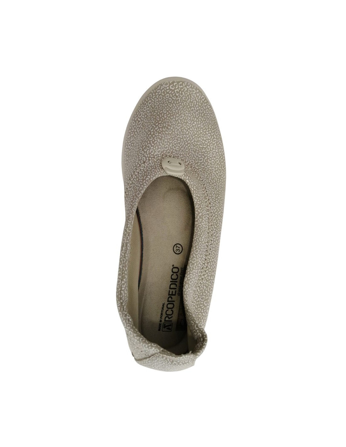 Descripción: Bailarina mujer Arcopedico CABRERA de licra estampada elástica estampada beig , reciclada, vegana.. Ajuste elástico. Piso de poliuretano inyectado con sistema de doble arco lateral para mejorar el apoyo.