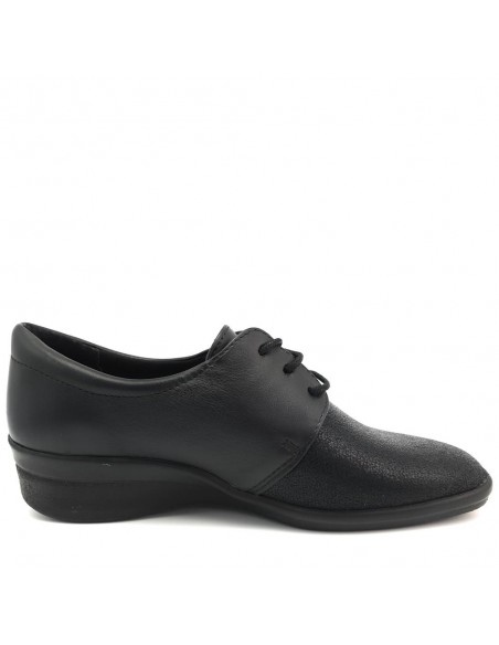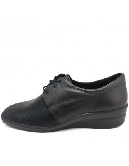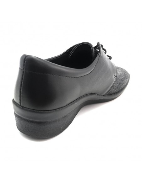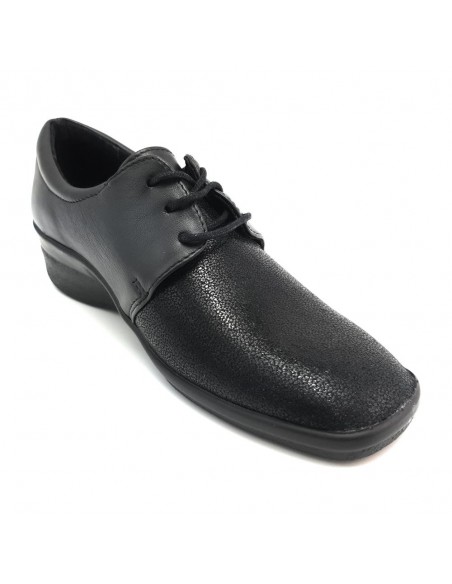 Descripción: Blucher mujer de LUMEL ELEGANTE-28 en piel negra y licra elástica con un toque metalizado. Plantilla extraible. Cómodo y ligero piso antideslizante.