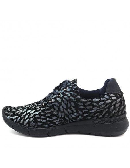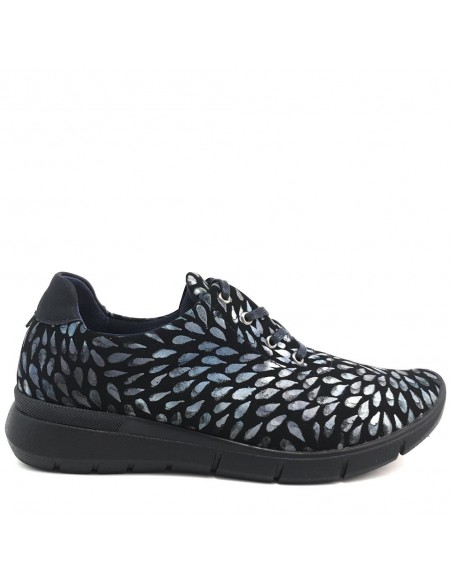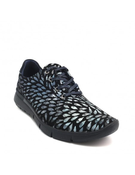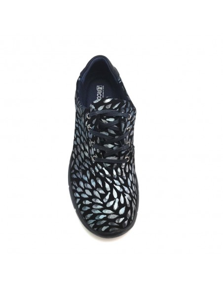 Descripción: Blucher Arcopedico L78 de nueva licra LAITECH azul estampado repelente al agua. Sin costuras, de una sola pieza. Piso ligero de poliuretano inyectado con refuerzo en la zona del puente para un mejor apoyo.
