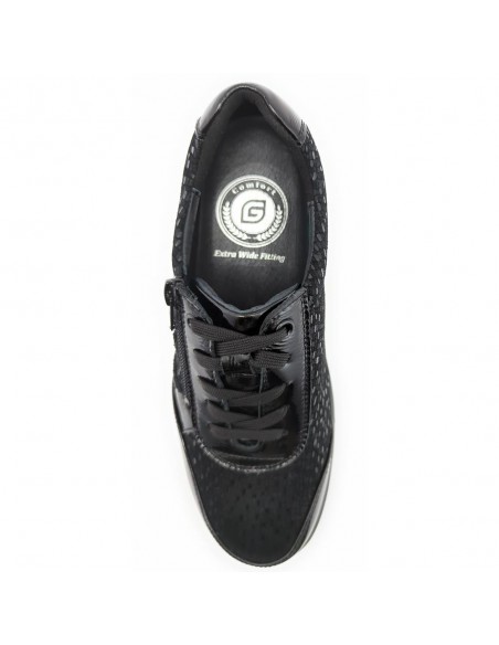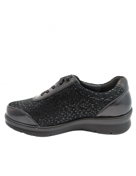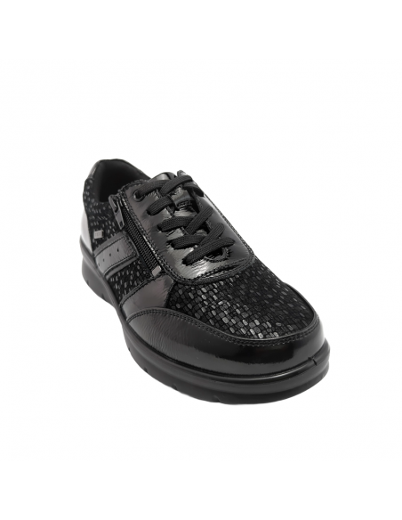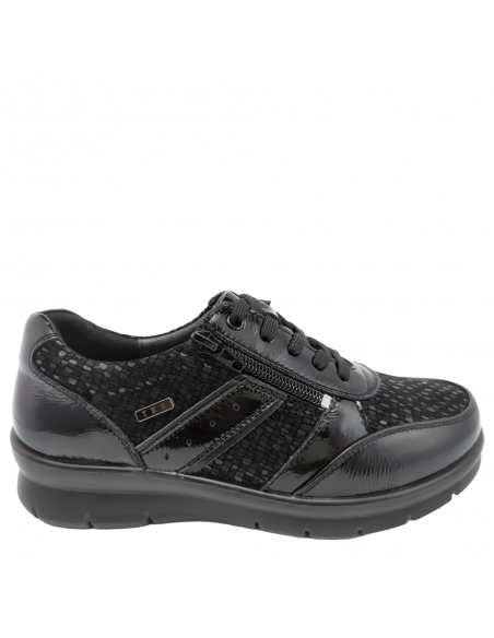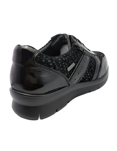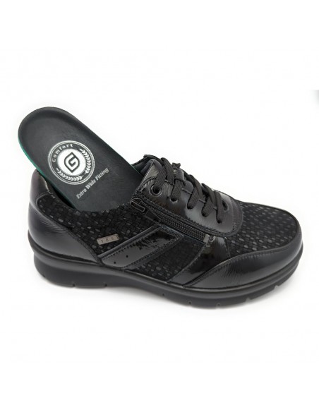 Descripción: Zapato cordones mujer de G Comfort modelo 8262-0 en licra y charol negros y ajuste cremallera. Con membrana impermeable y transpirable. Cómoda cuña ligera de poliuretano inyectado antideslizante.