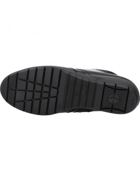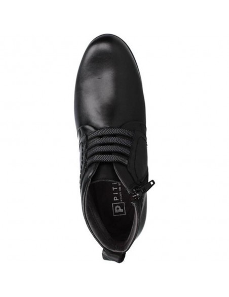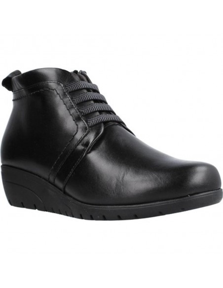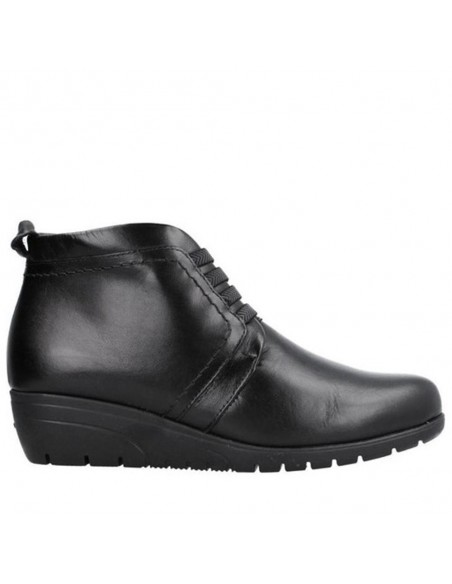 Descripción: Práctico botín mujer Pitillos 2334 en piel lisa negra. Ajuste con cordones elásticos y cremallera lateral. Plantilla anatómica móvil antibacteriana. Cómoda cuña de poliuretano ligera y flexible.