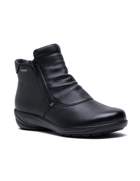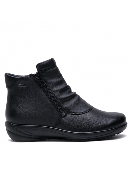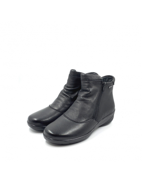 Descripción: Botín mujer de G Comfort modelo 9521-0 en suave piel negra con detalle arrugado y doble cremallera. Con membrana impermeable y transpirable. Cómoda cuña ligera de poliuretano inyectado antideslizante.