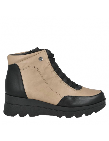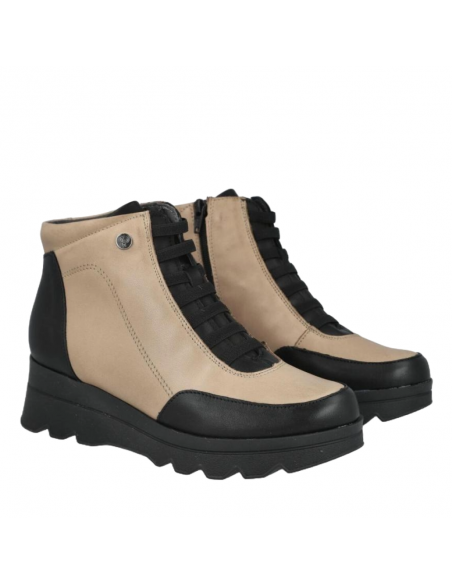 Descripción: Elegante botín mujer Pitillos 5356 en suave piel combinada taupe y negra. Ajuste cremallera lateral y cordones elásticos. Plantilla anatómica móvil antibacteriana. Cómoda cuña ligera de poliuretano.