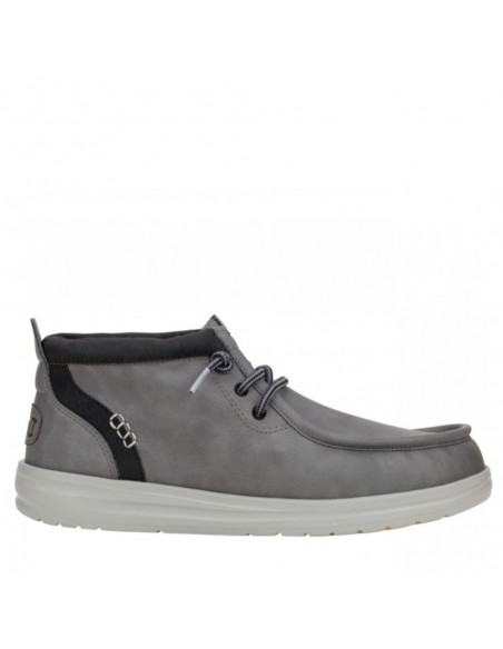Descripción: Botín hombre WALLY MID GRIPR CLASSIC de HEY DUDE fácil de poner con los con cordones elásticos, en suave microfibra gris repelente al agua. Plantilla ergonómica extraíble. Suela súper ligera, flexible y antideslizante.