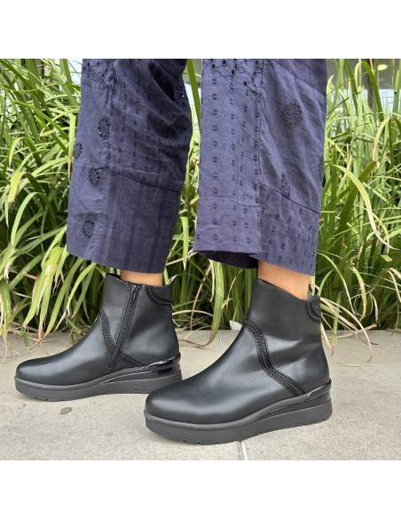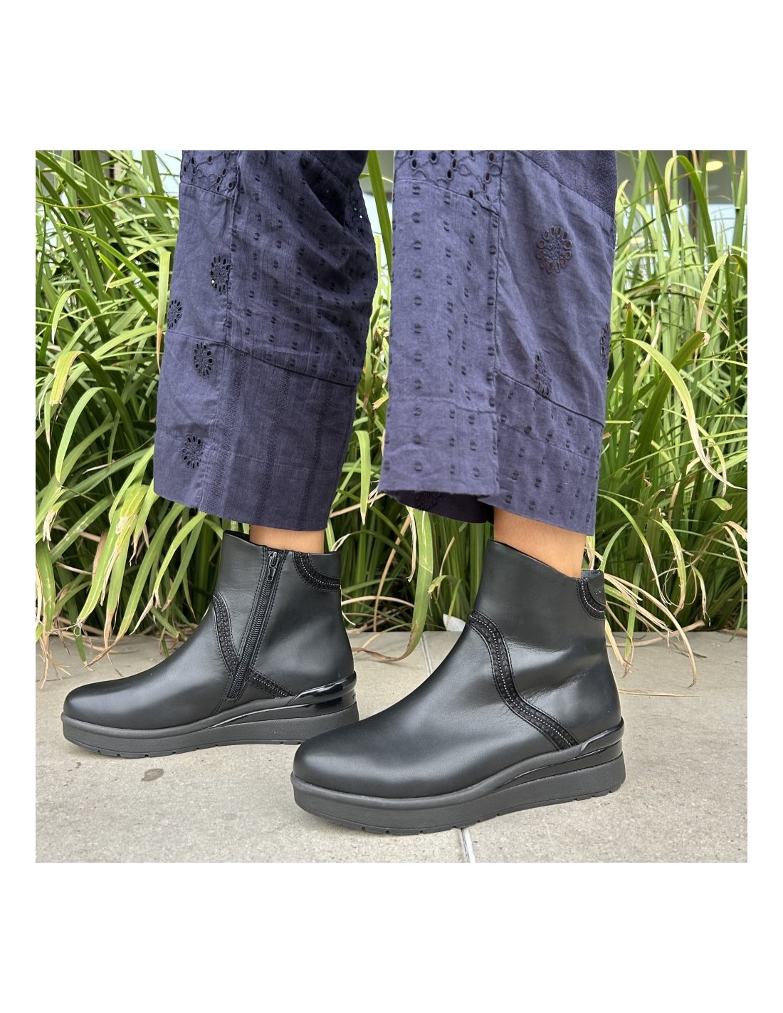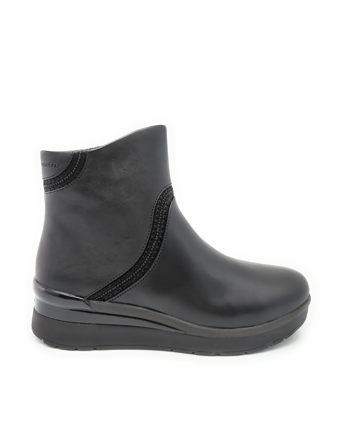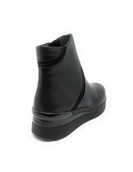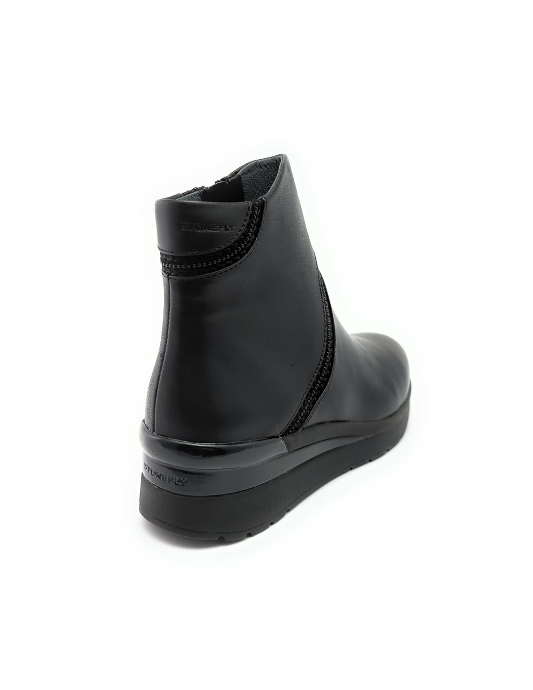 Descripción: Cómodo y elegante botín mujer de Stonefly CREAM-55 en suave piel negra y detalles de pedrería. Ajuste con cremallera. Ligera cuña con tecnología BLUSOFT que garantiza una amortiguación perfecta.
