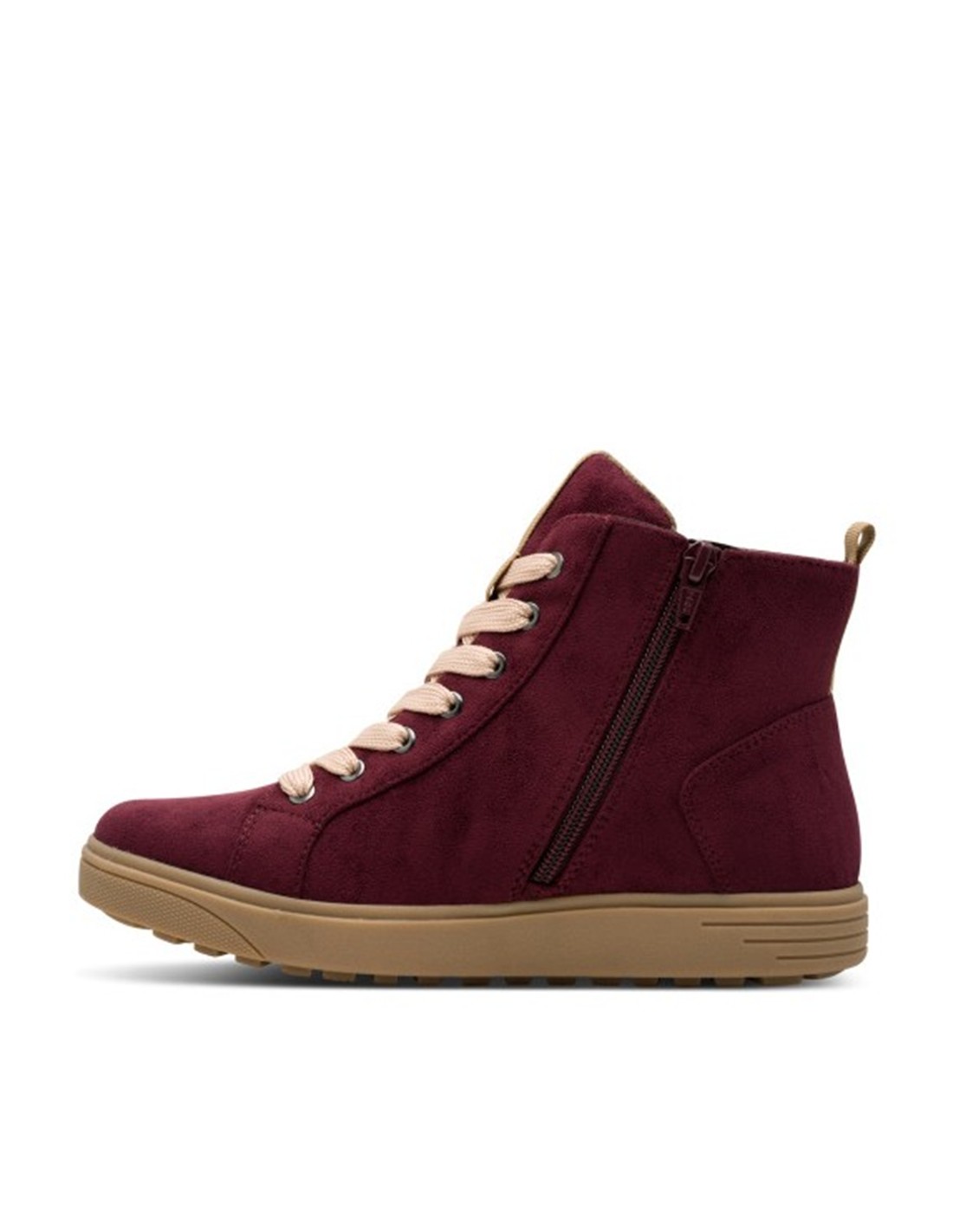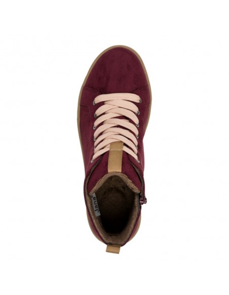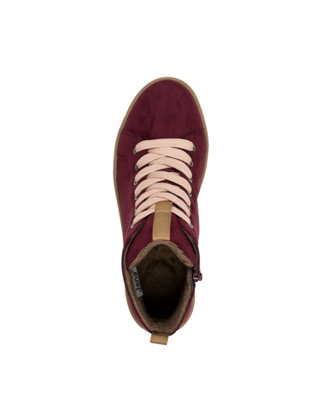 Descripción: Botín deportivo CON CERTIFICADO VEGANO mujer 25280 de Jana en suave tejido burdeos con cremallera lateral y cordones.Plantilla anatómica móvil. Cómoda cuña ligera, flexible y amortiguadora. Cordón beig y otro al tono de repuesto.