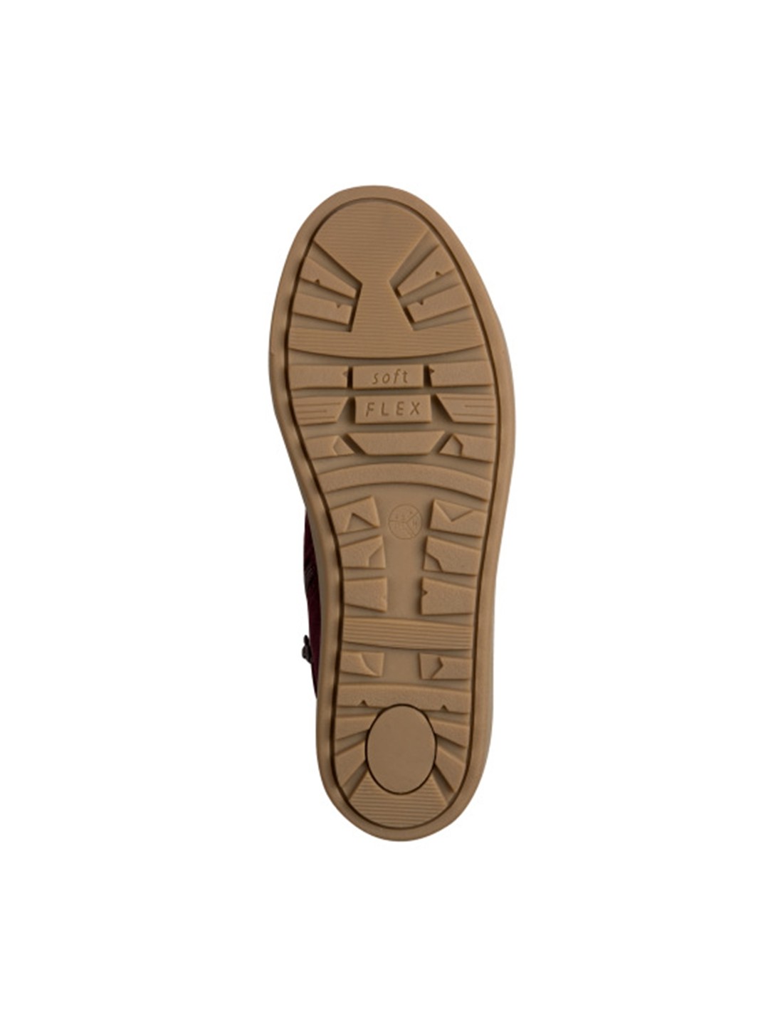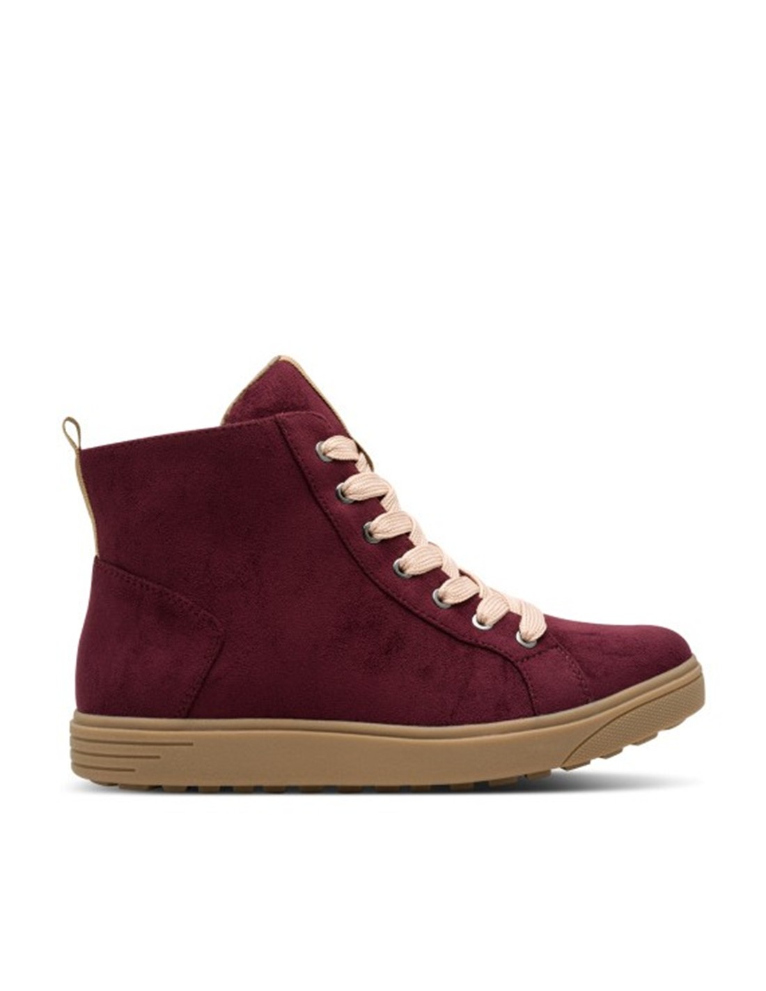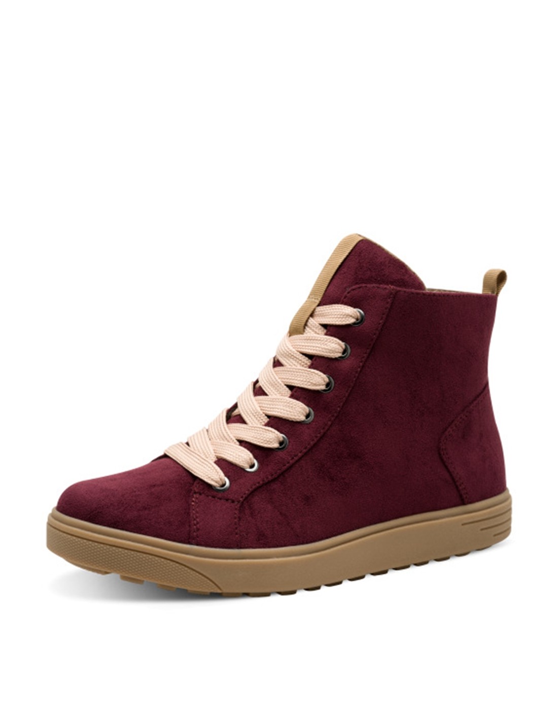 Descripción: Botín deportivo CON CERTIFICADO VEGANO mujer 25280 de Jana en suave tejido burdeos con cremallera lateral y cordones.Plantilla anatómica móvil. Cómoda cuña ligera, flexible y amortiguadora. Cordón beig y otro al tono de repuesto.