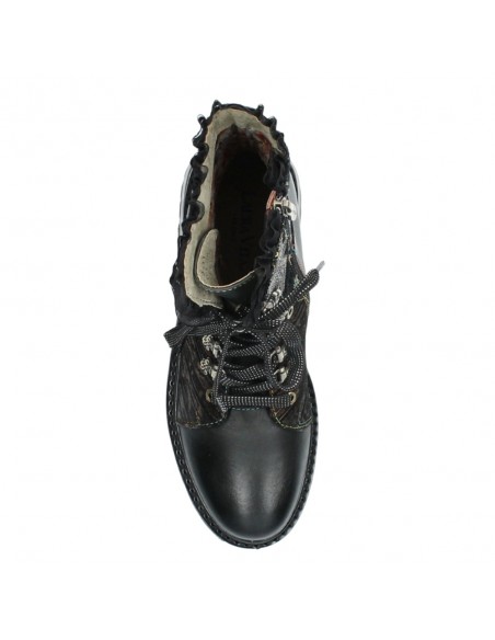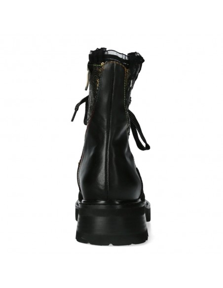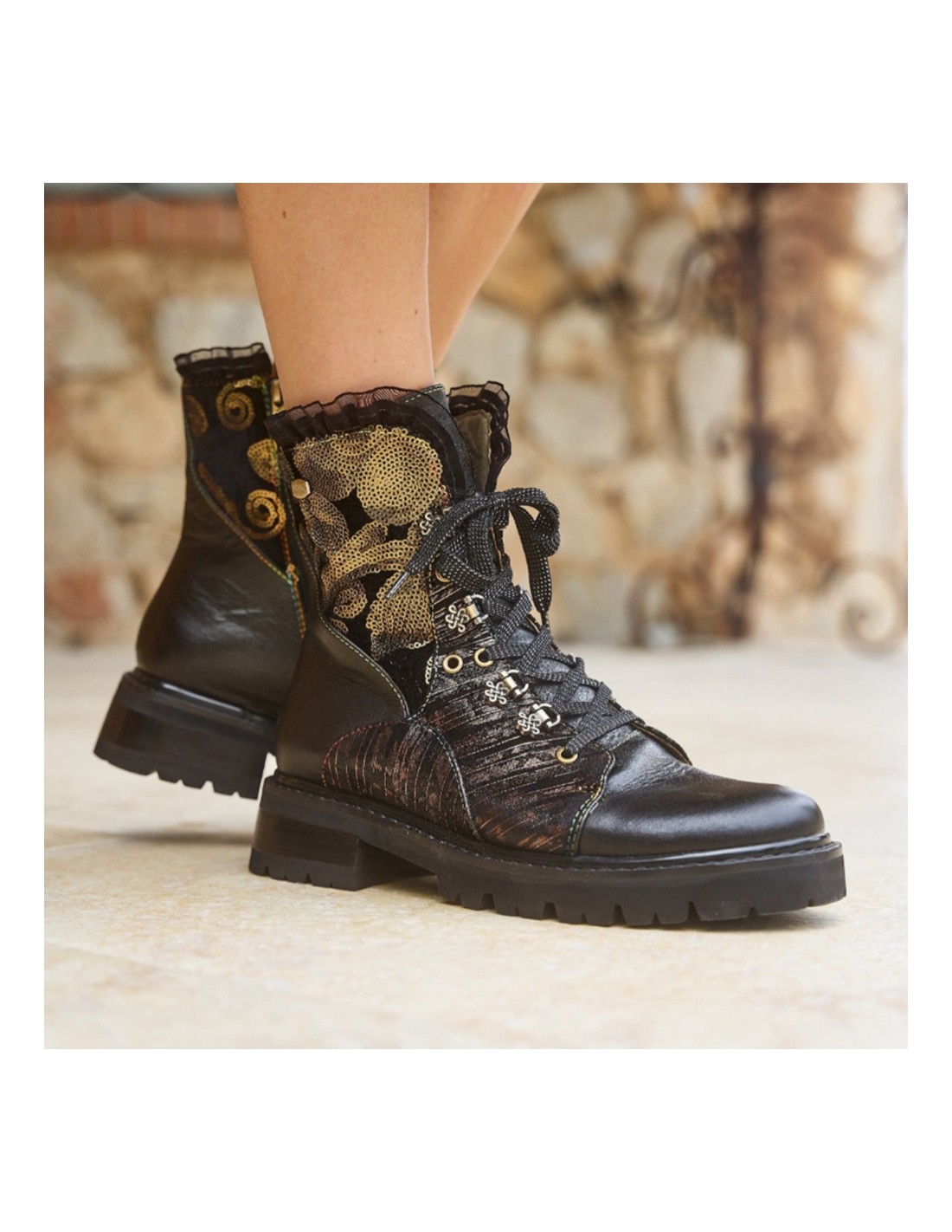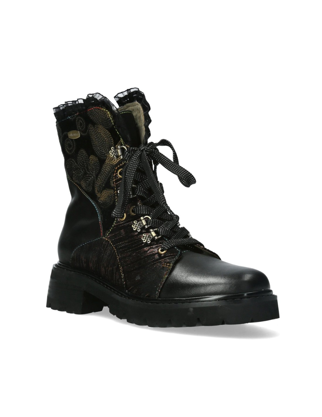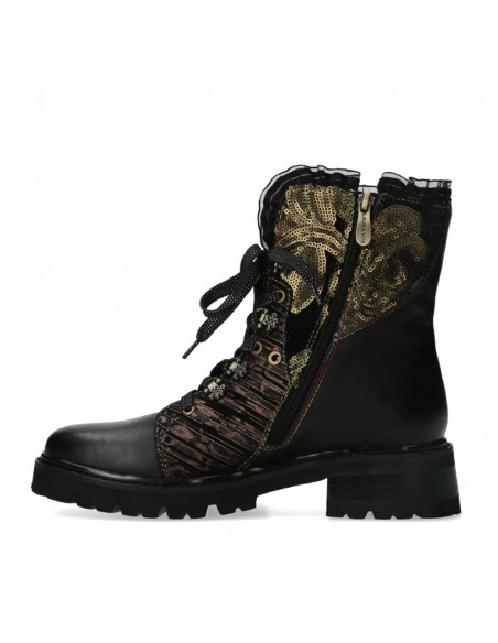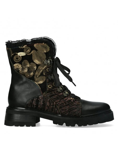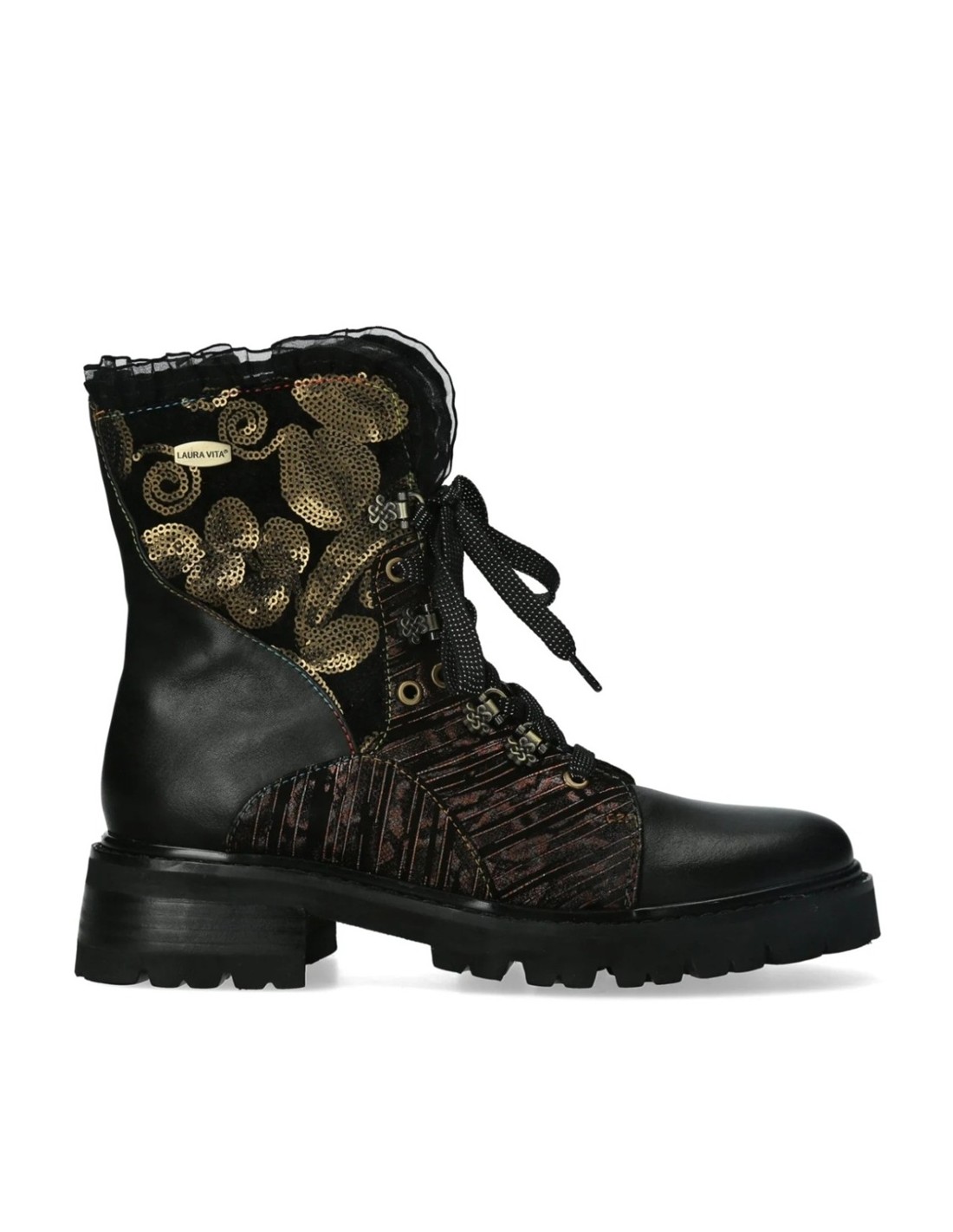 Descripción: Botín mujer Laura Vita KOULEO-66 en piel negra y detalles florales. Ajuste cremallera y cordón. Esta marca ofrece originalidad inspirada en la naturaleza y las artes, colorido nuevo cada temporada.