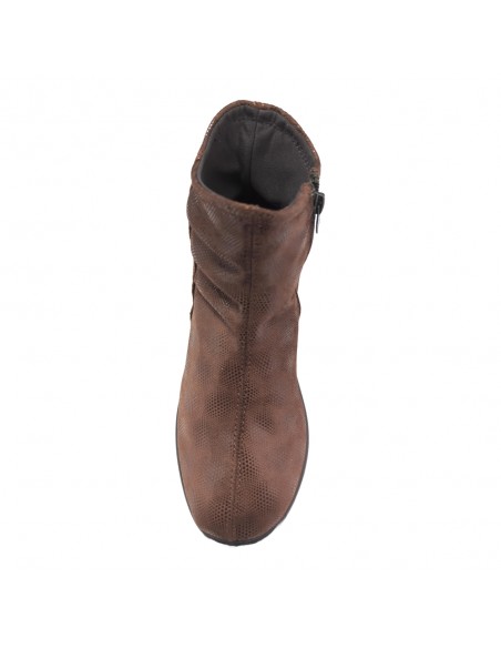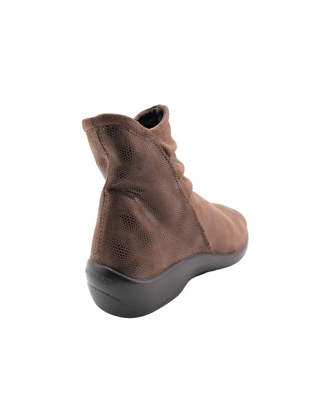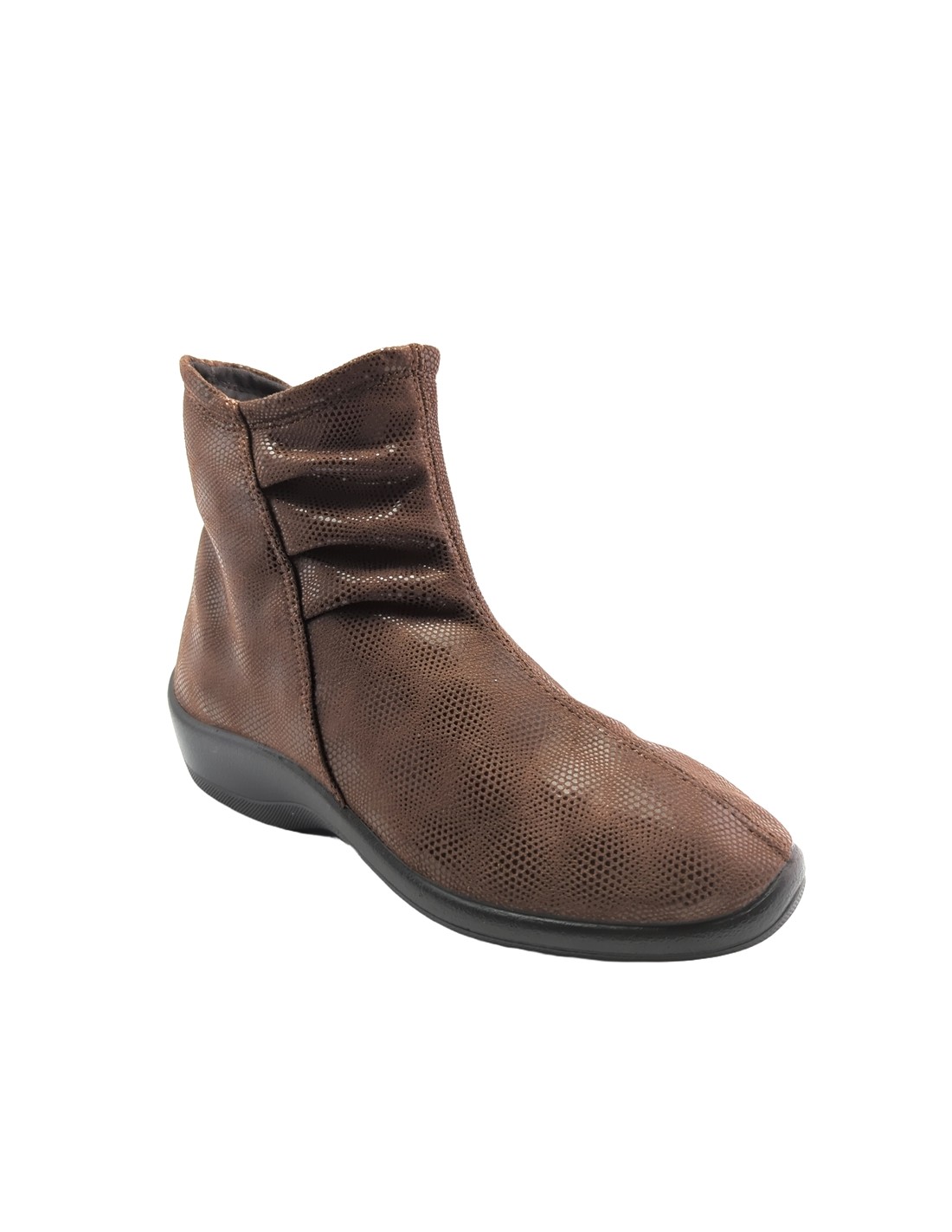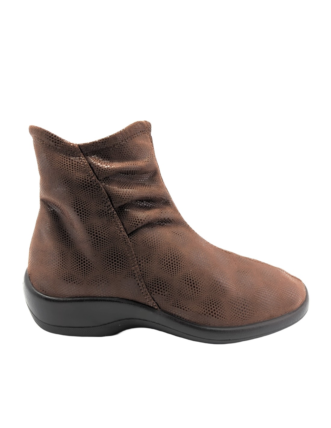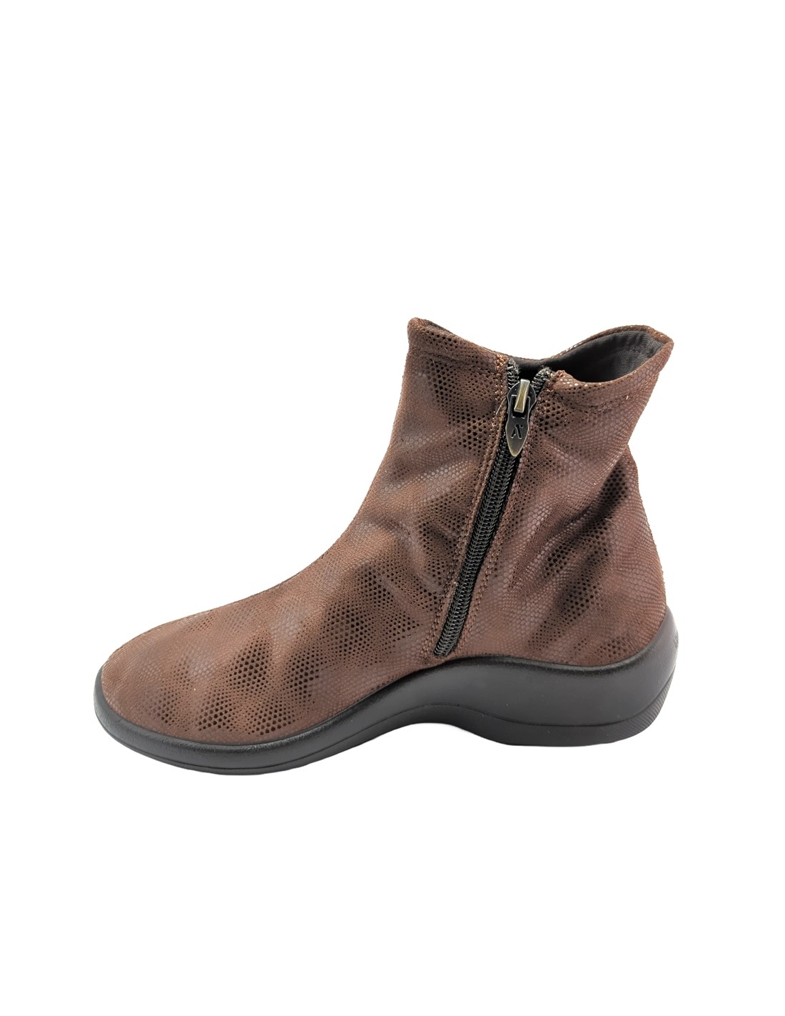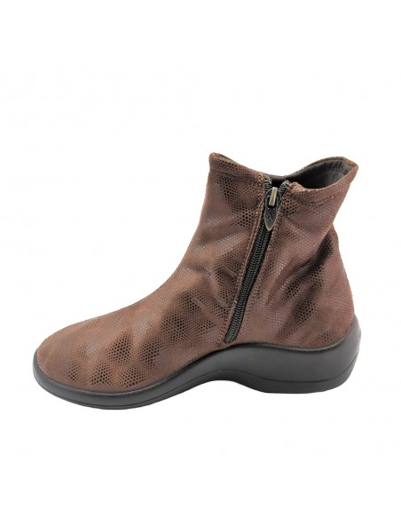 Descripción: Botín mujer Arcopedico PALUMA de licra marrón elástica aspecto piel lisa, ligeramente arrugada, reciclada, vegana e hidrofugada. Ajuste cremallera. Piso de poliuretano inyectado con sistema de doble aarco para mejorar el apoyo.