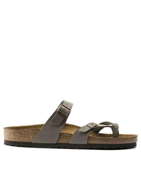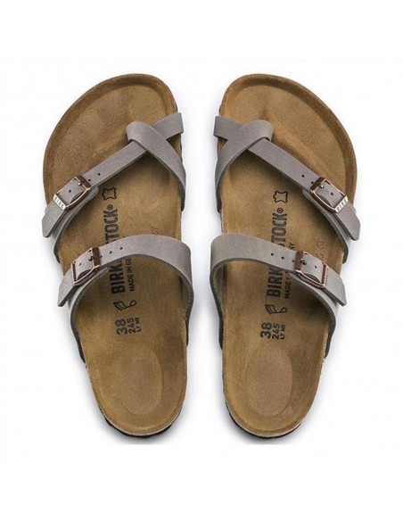 Descripción: Cómoda chancla BIO mujer de Birkentock. Modelo entrededos MAYARI Birko Flor stone con ajuste de hebillas. Planta anatómica que recoge a la perfección la silueta del pie. Piso de EVA ligero y antideslizante.