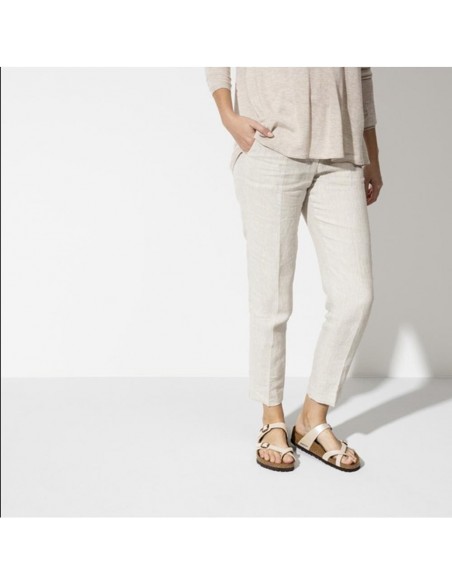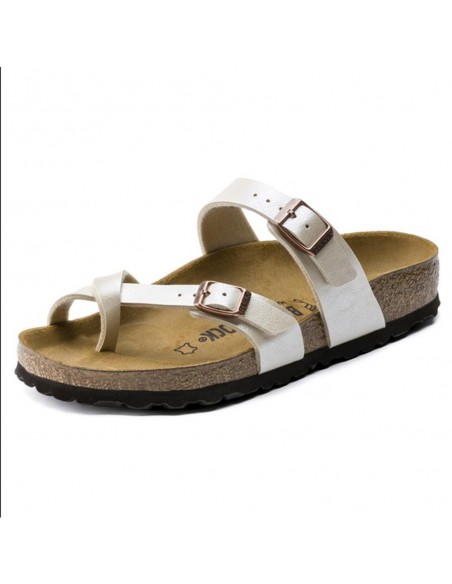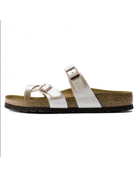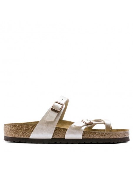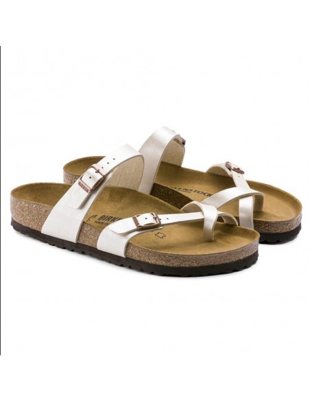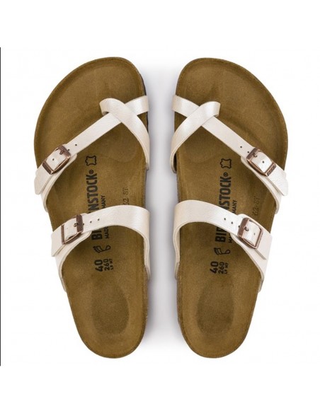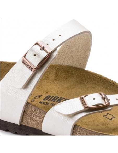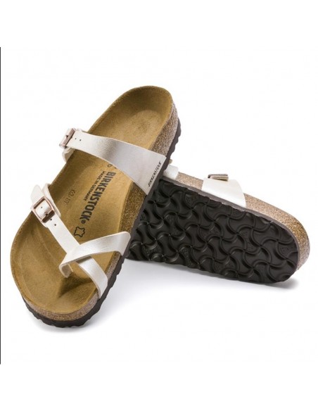 Descripción: Cómoda chancla BIO entre dedos mujer de Birkentock. Clásico modelo MAYARI, nuevo color PEARL WHITE, ajuste de hebilla. Planta anatómica, recoge la silueta del pie. Piso de EVA ligero y antideslizante.