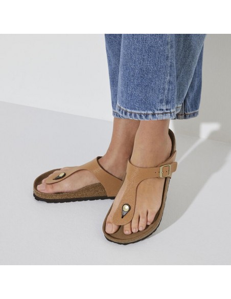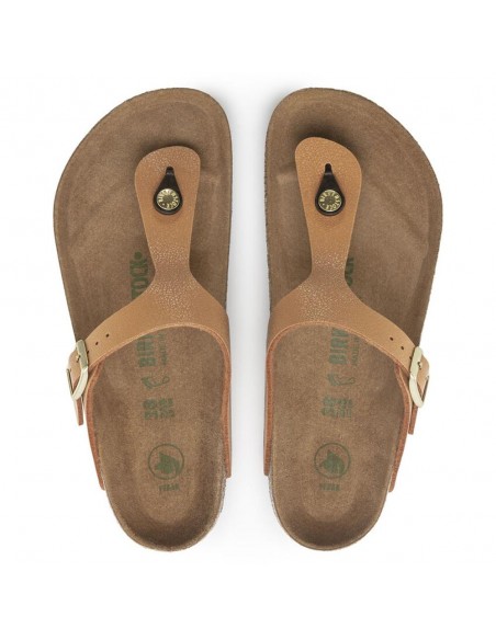 Descripción: Cómoda chancla BIO entre dedos mujer de Birkentock. Clásico modelo GIZEH ahora nueva línea VEGANA Earthy en tono Pecan. Ajuste de hebilla. Planta anatómica que envuelve el pie.