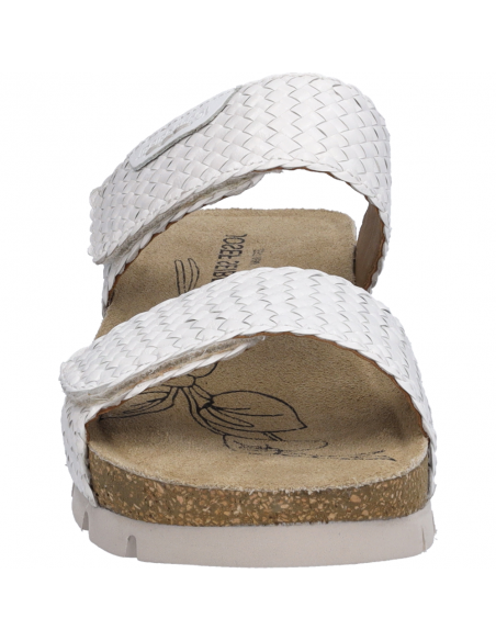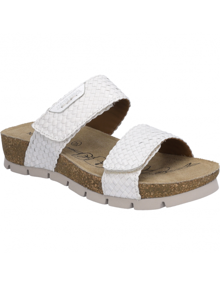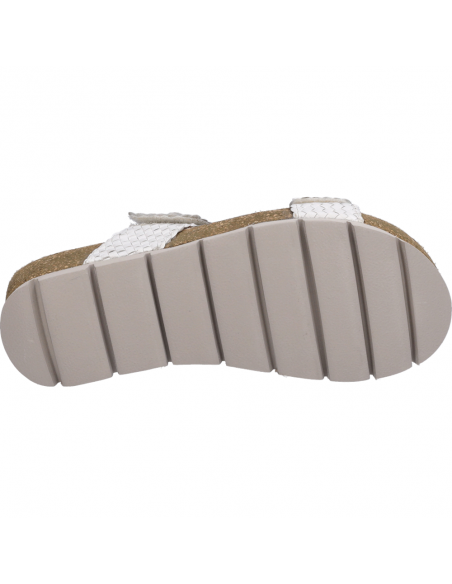 Descripción: Sandalia mujer de Josef Seibel Lucie-04 en suave piel trenzada blanca y tiras con ajustes de velcros. Planta acolchada tipo BIO anatómica. Piso de TR bronce con dibujo antideslizante.