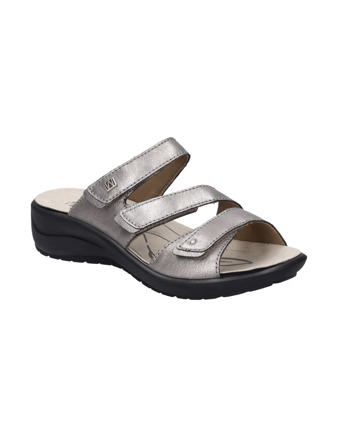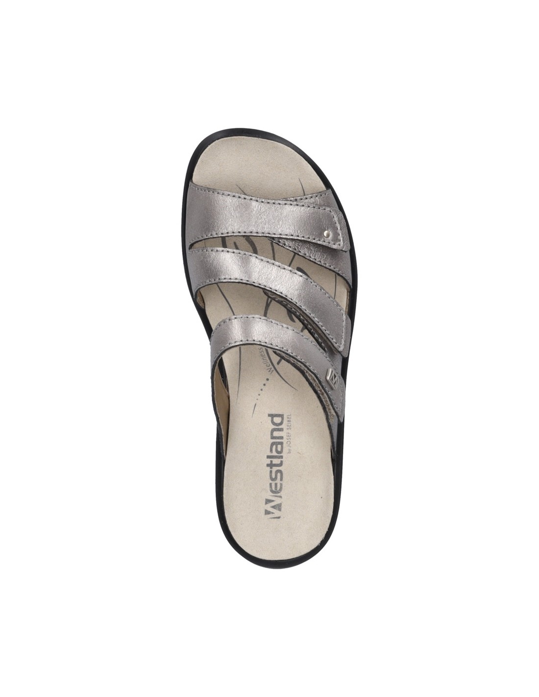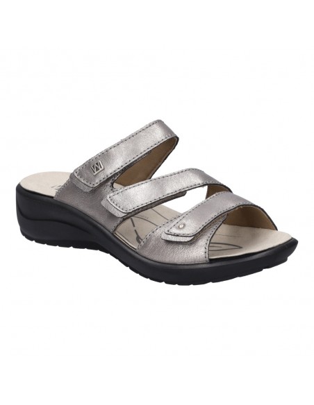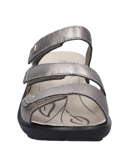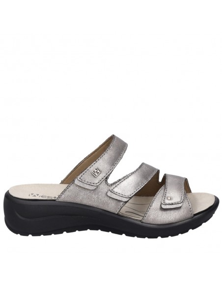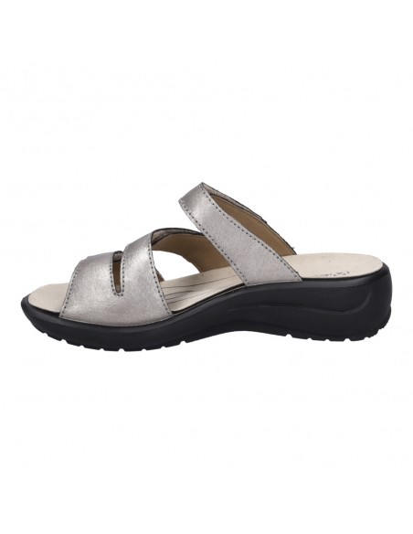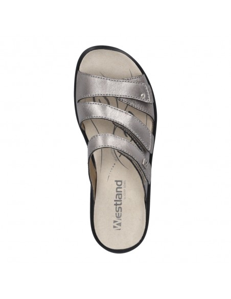 Descripción: Chancla mujer Westland by Josef Seibel ANNECY-04 en piel metalizada platino. Tiras ajustables con velcro. Plantilla extraible anatómica y acolchada. Cómoda cuña ligera de poliuretano antideslizante.