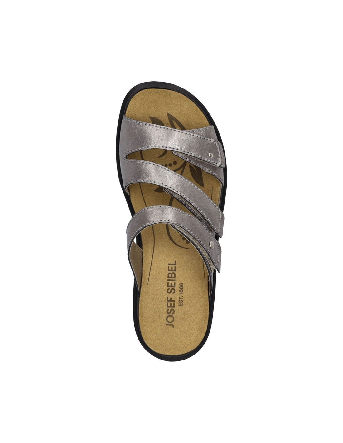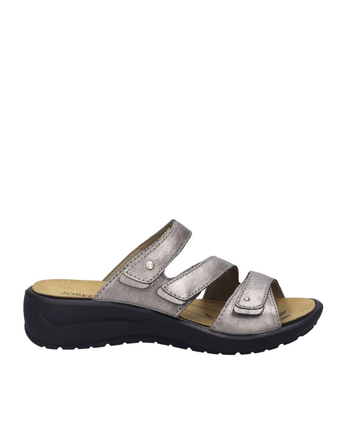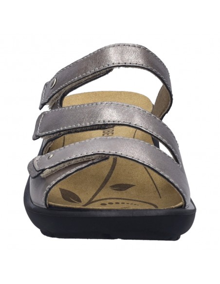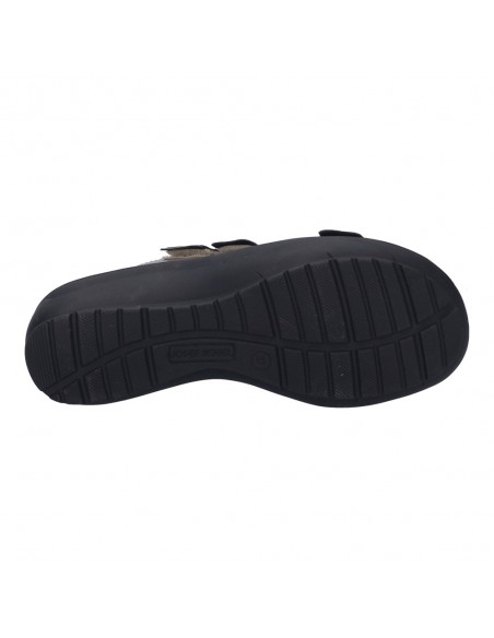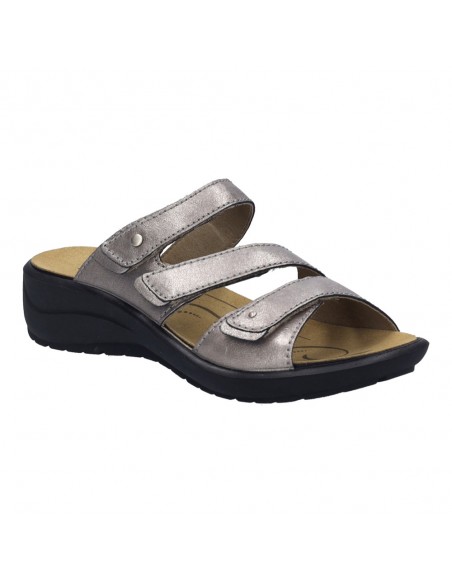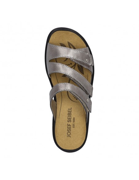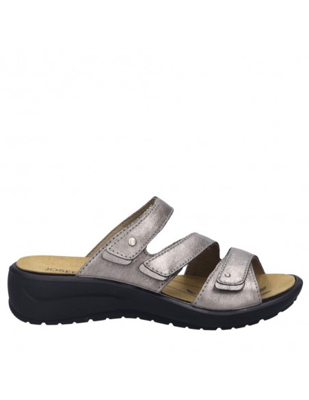 Descripción: Chancla mujer de Josef Seibel ANNECY-04 en suave piel platino y detalles oro. Ajuste con velcros. Planta anatómica extraible. Piso de poliuretano inyectado ligero y con dibujo antideslizante.