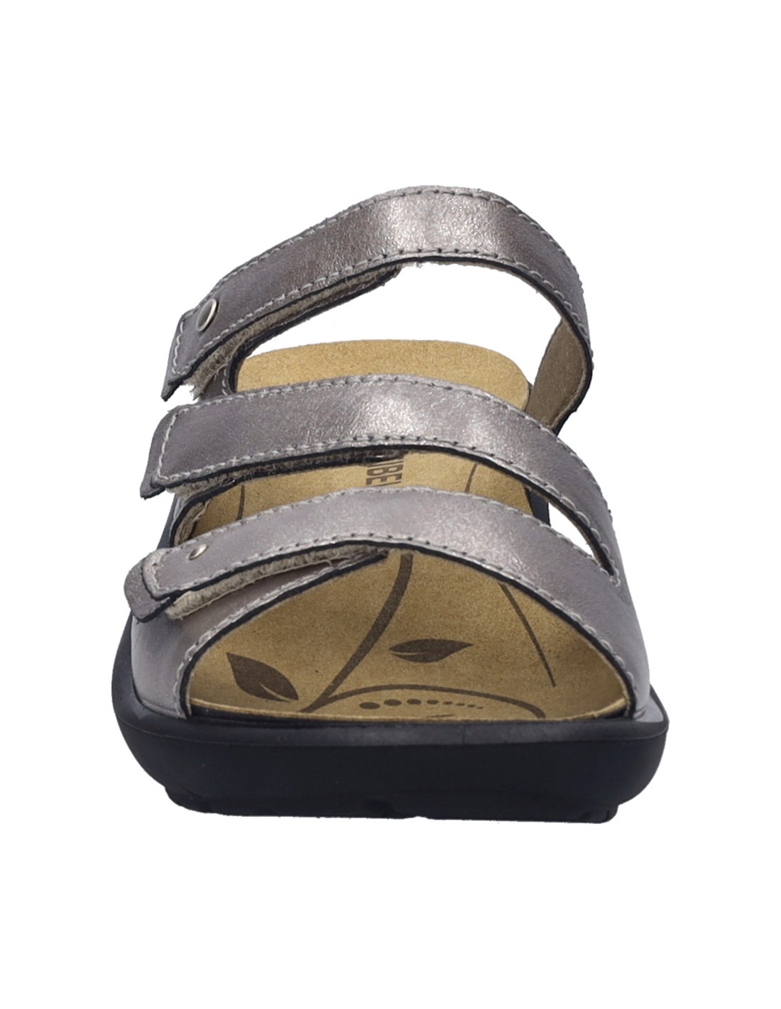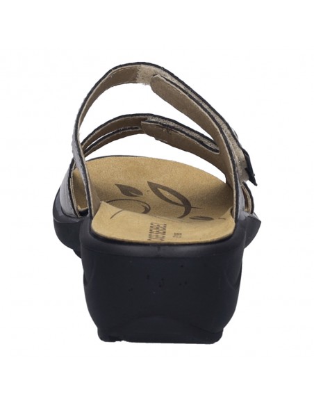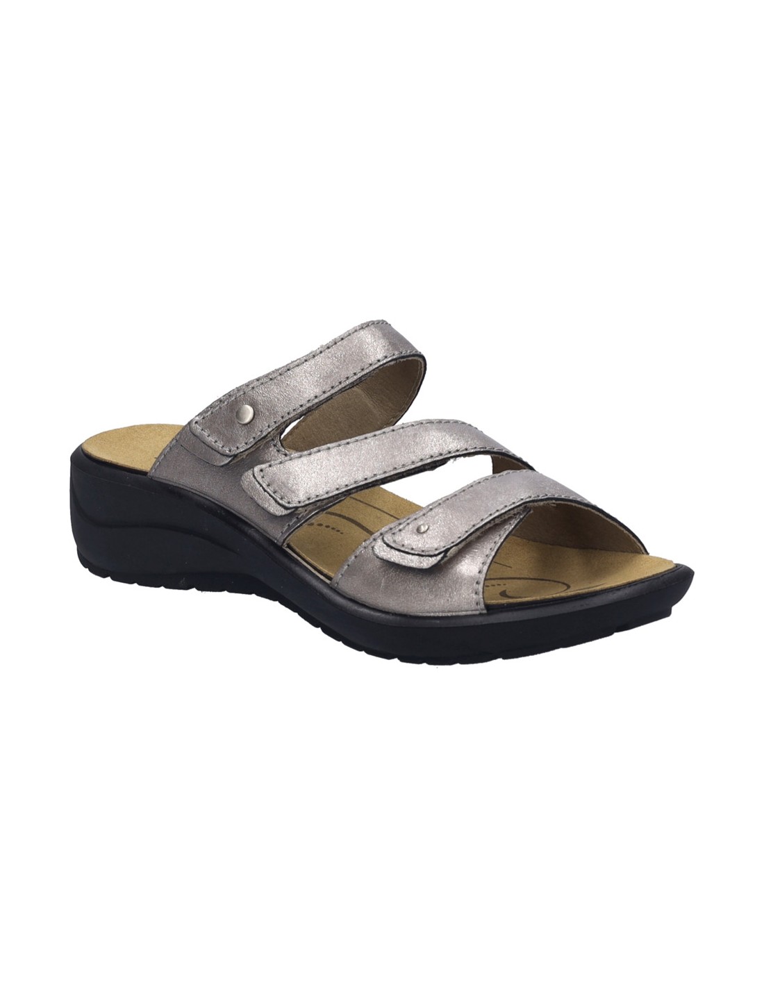 Descripción: Chancla mujer de Josef Seibel ANNECY-04 en suave piel platino y detalles oro. Ajuste con velcros. Planta anatómica extraible. Piso de poliuretano inyectado ligero y con dibujo antideslizante.