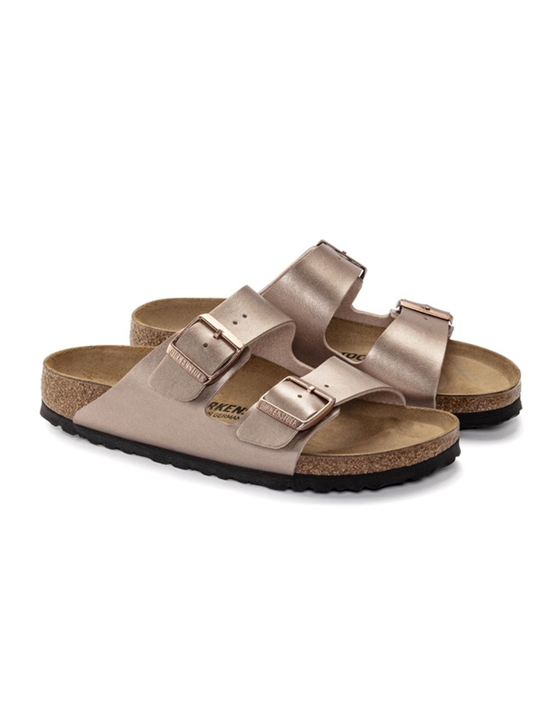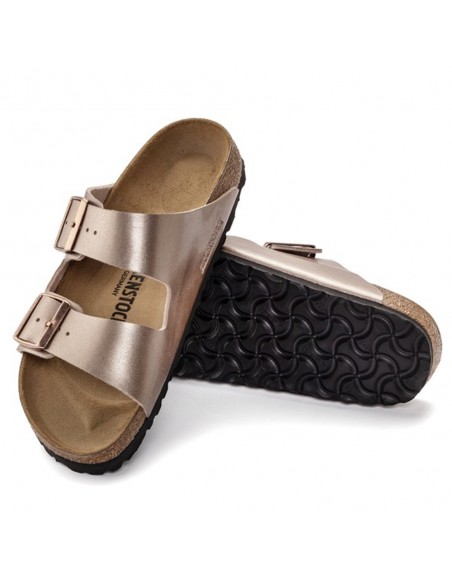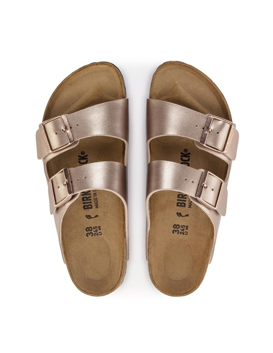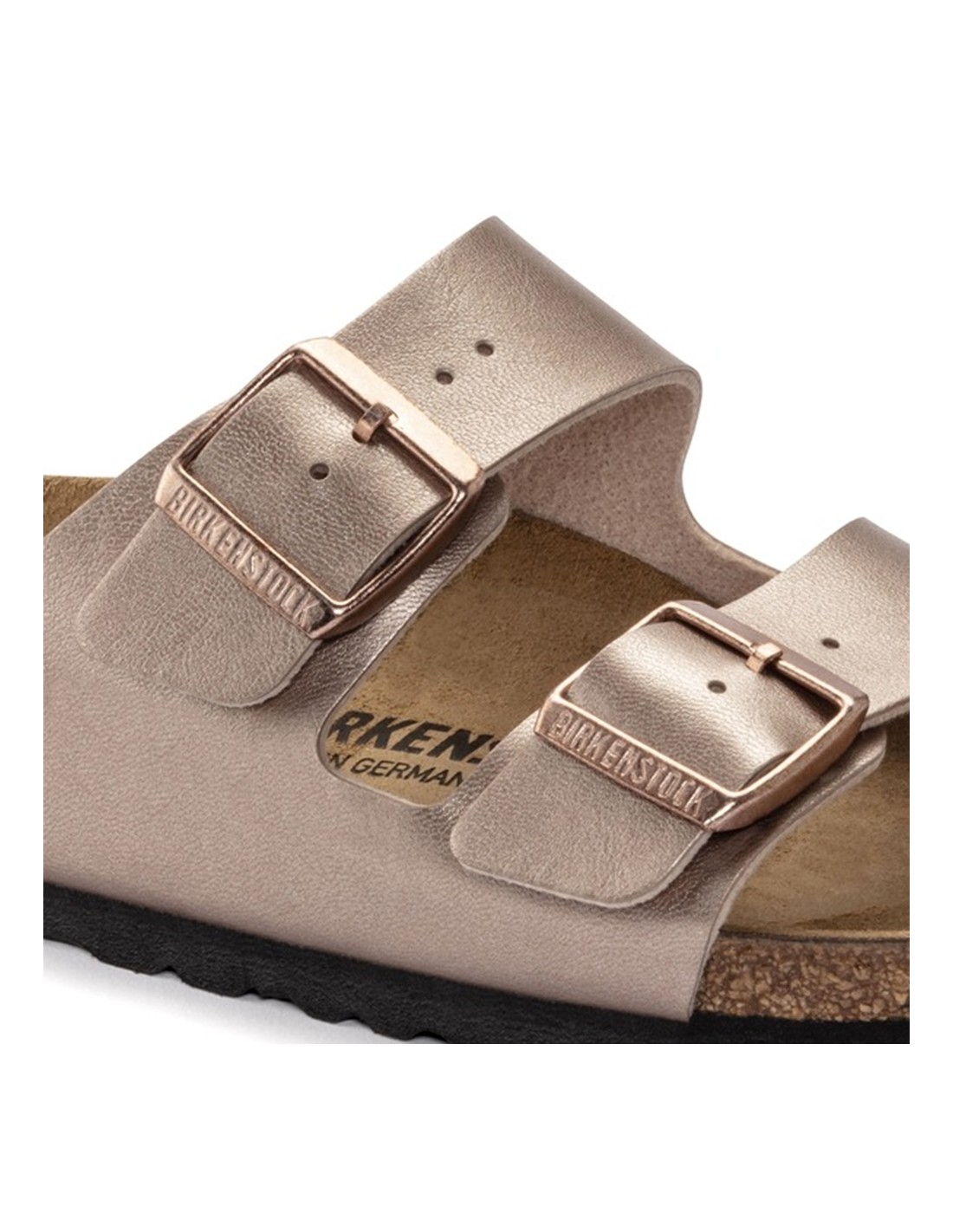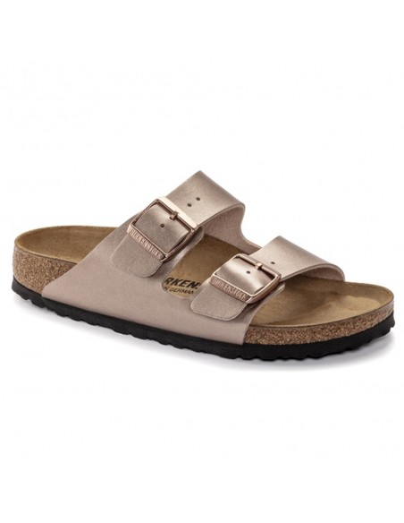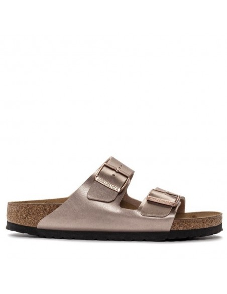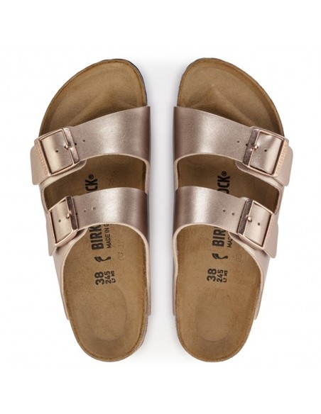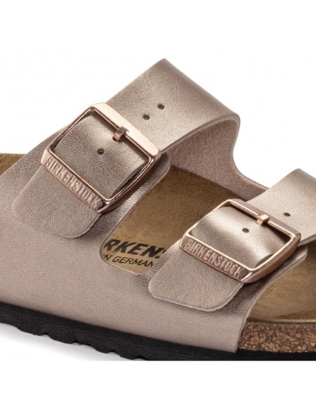 Descripción: Cómoda chancla BIO mujer de Birkentock. Clásico modelo Arizona de hebillas ahora en Birko-Flor metalic copper. Horma estrecha. Planta anatómica que recoge a la perfección la silueta del pie. Piso de EVA ligero y antideslizante.