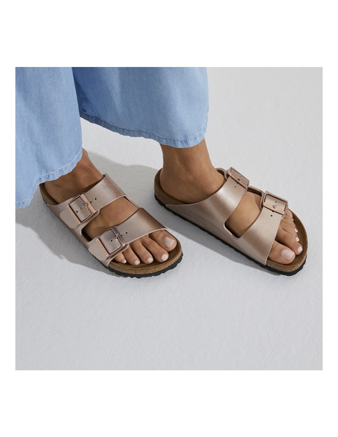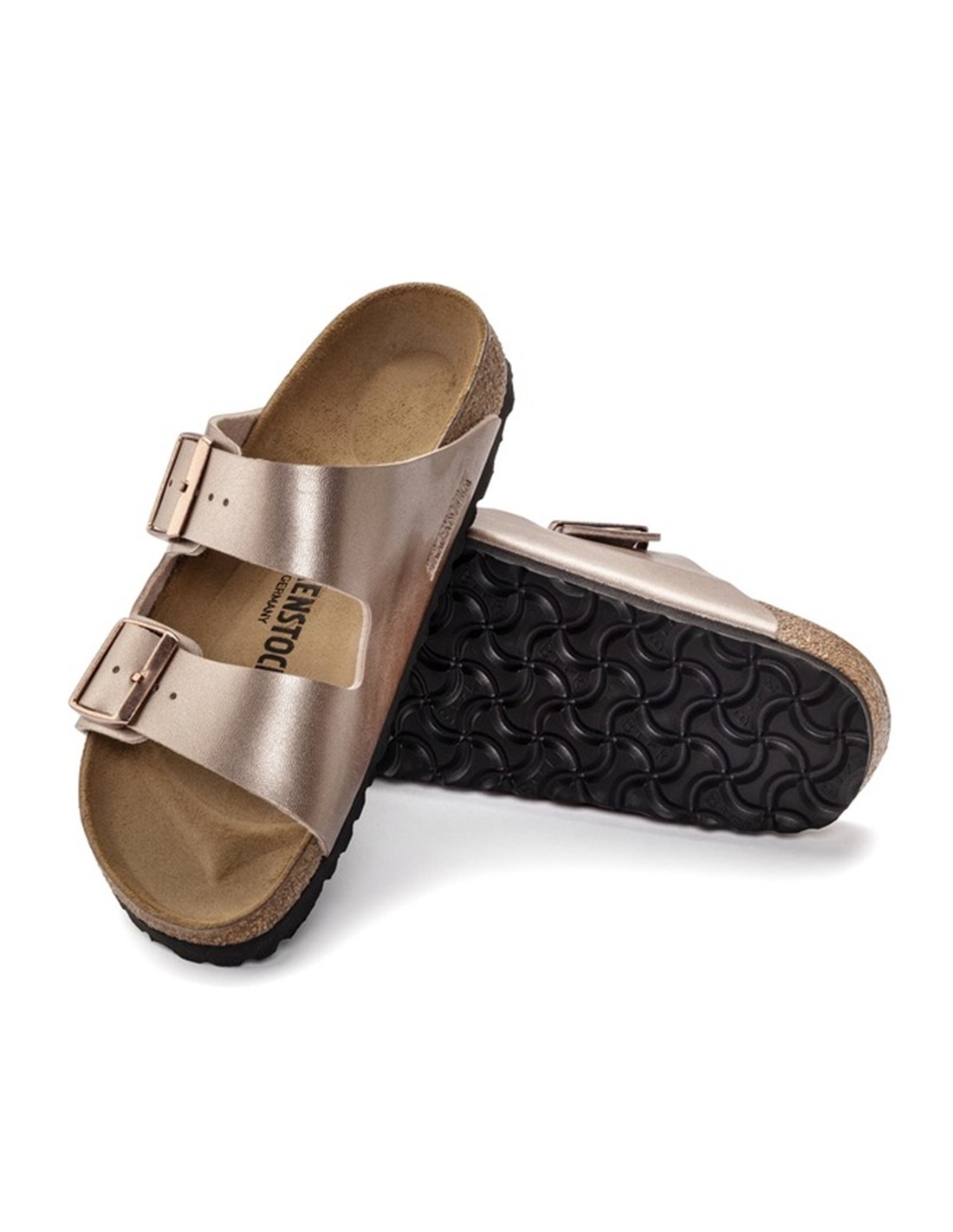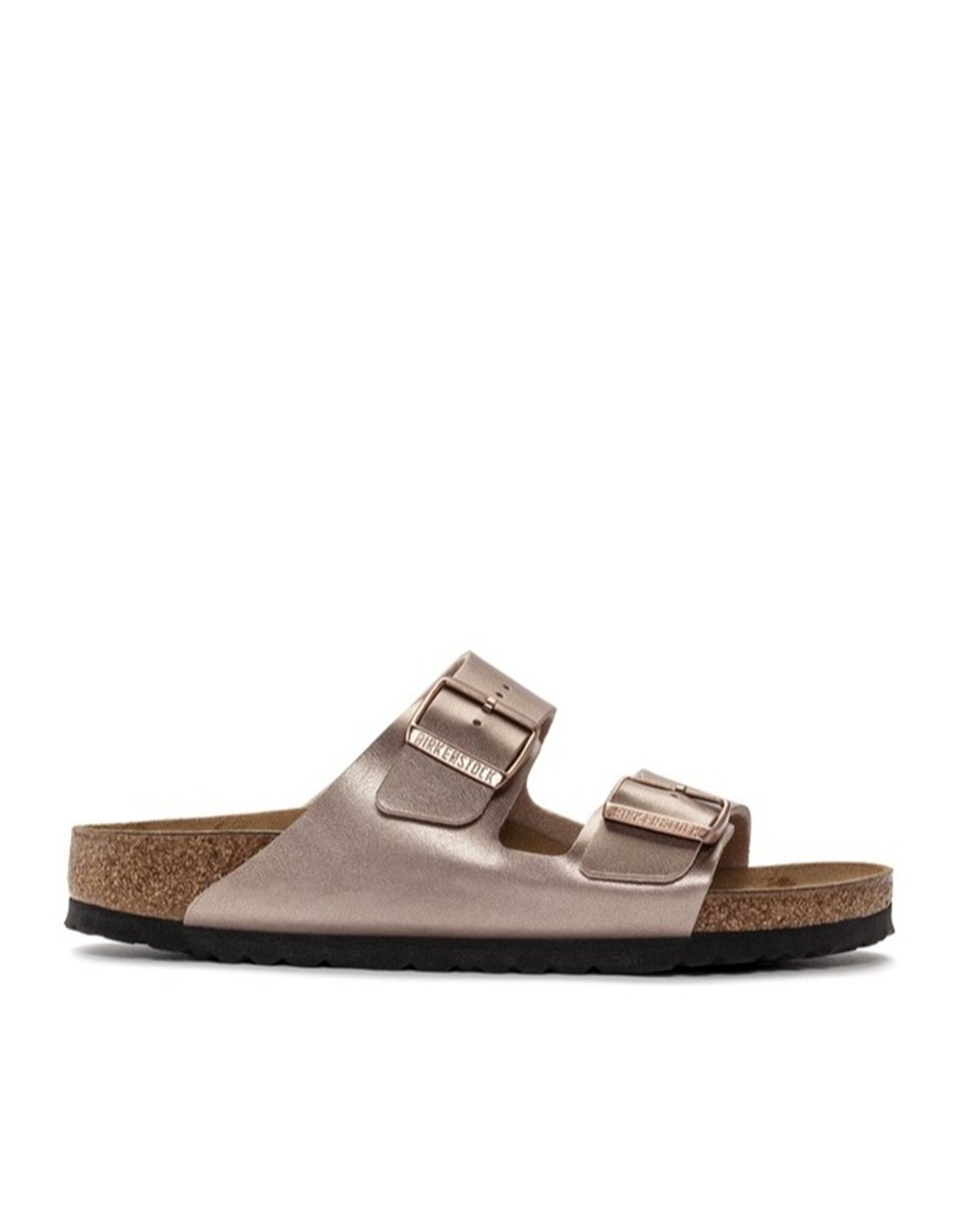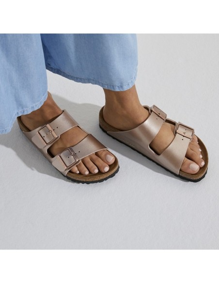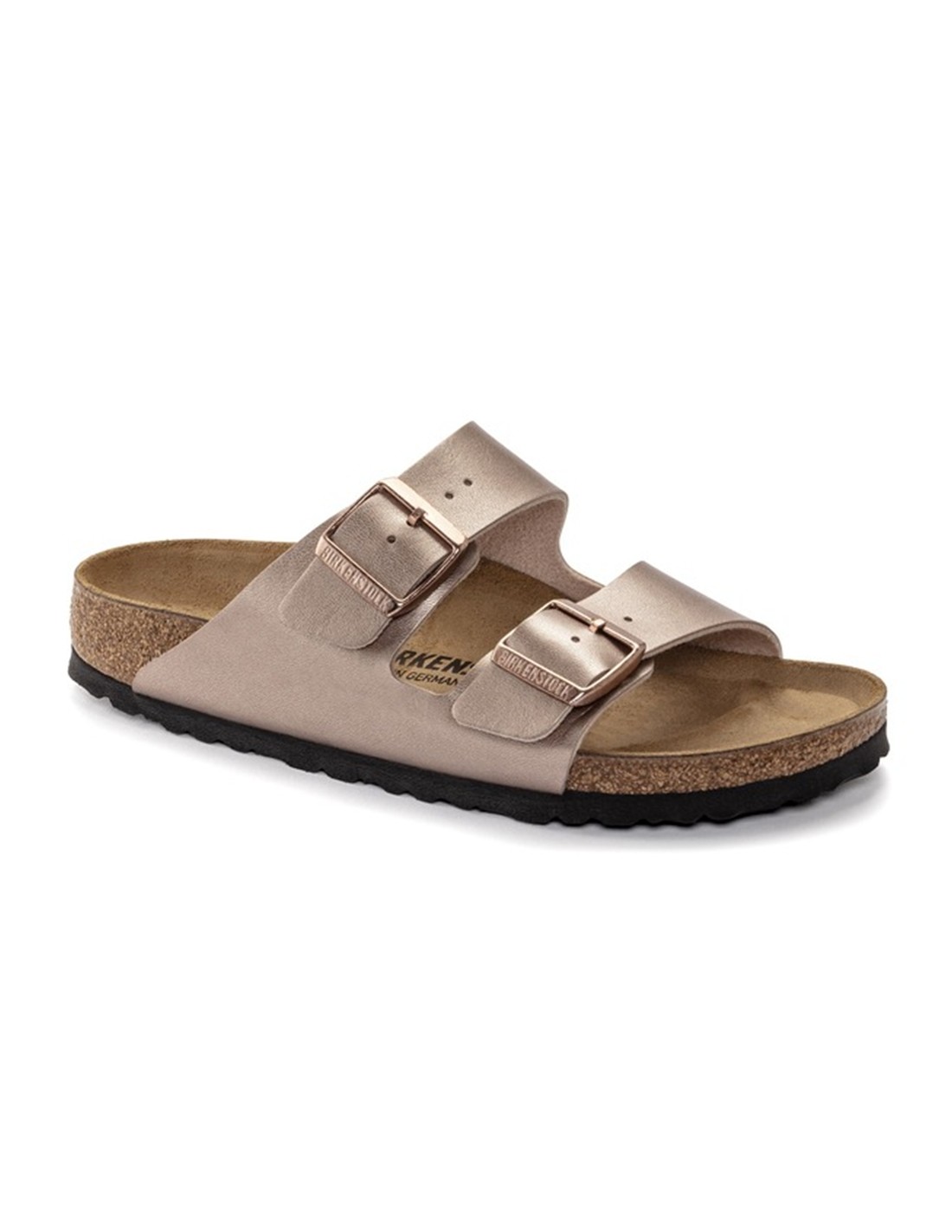Descripción: Cómoda chancla BIO mujer de Birkentock. Clásico modelo Arizona de hebillas ahora en Birko-Flor metalic copper. Horma estrecha. Planta anatómica que recoge a la perfección la silueta del pie. Piso de EVA ligero y antideslizante.