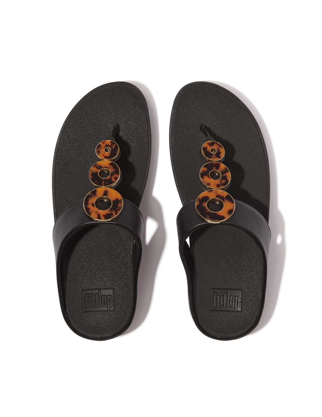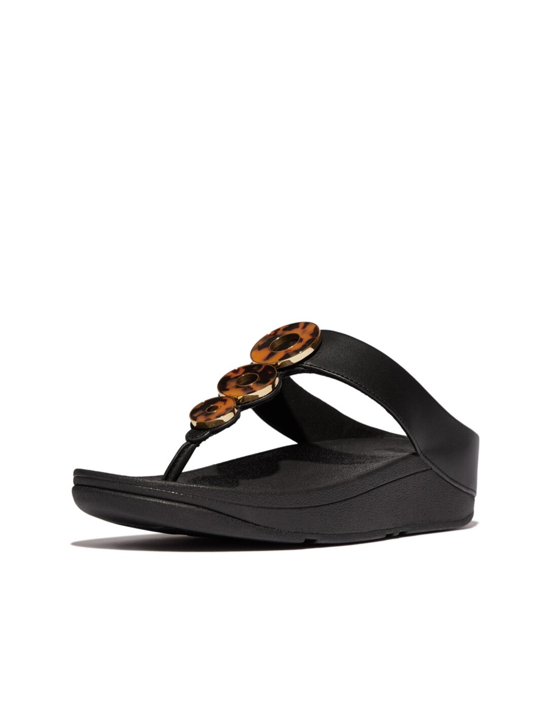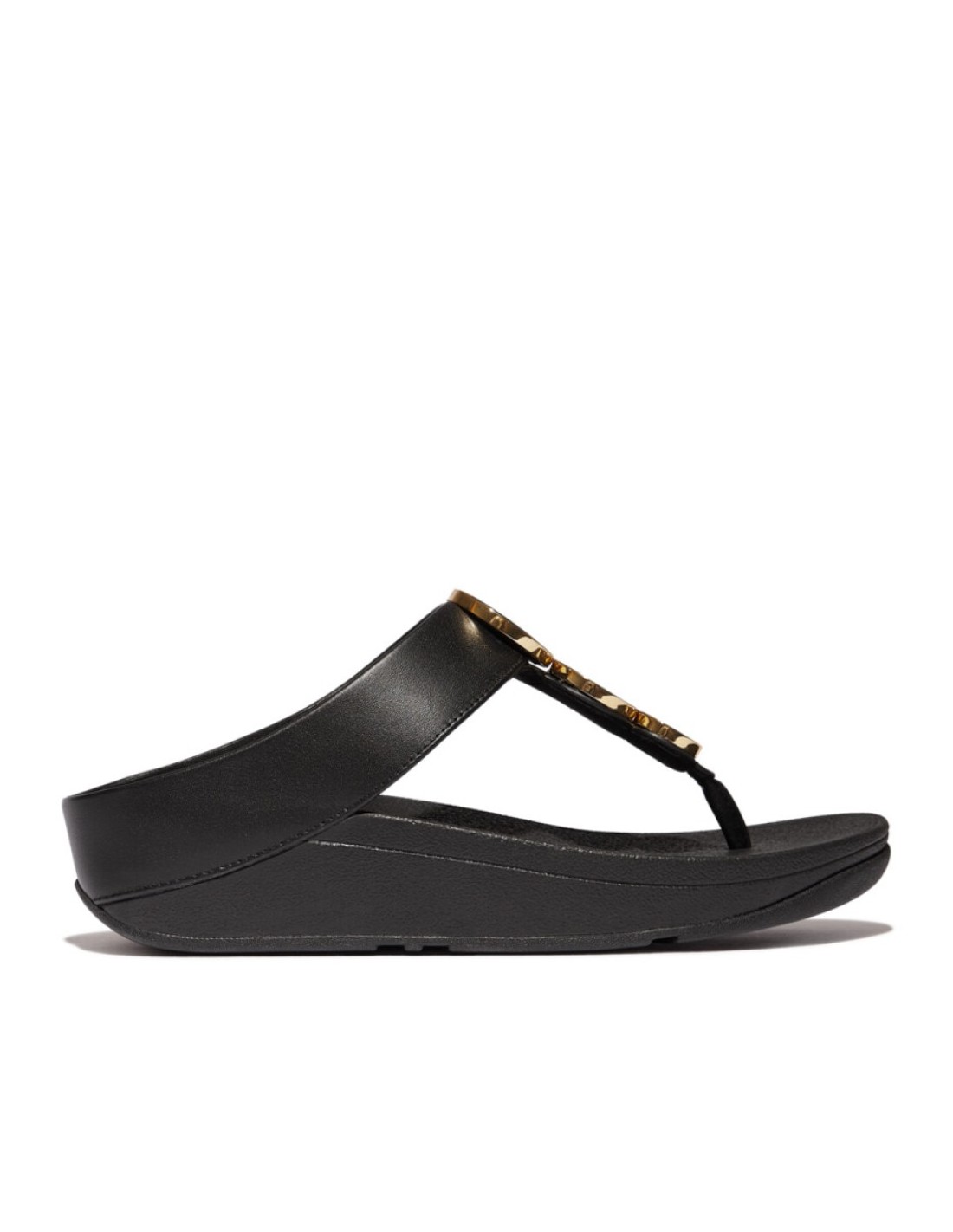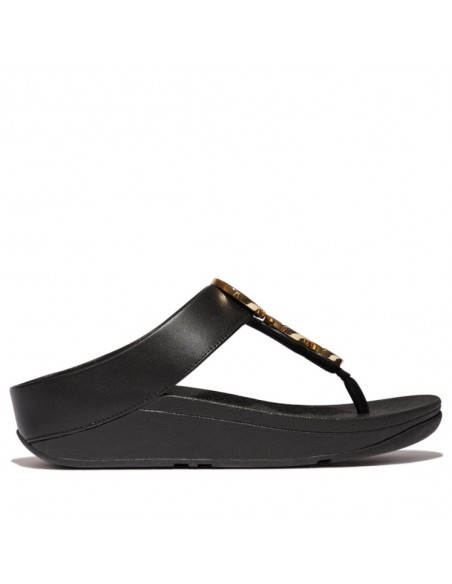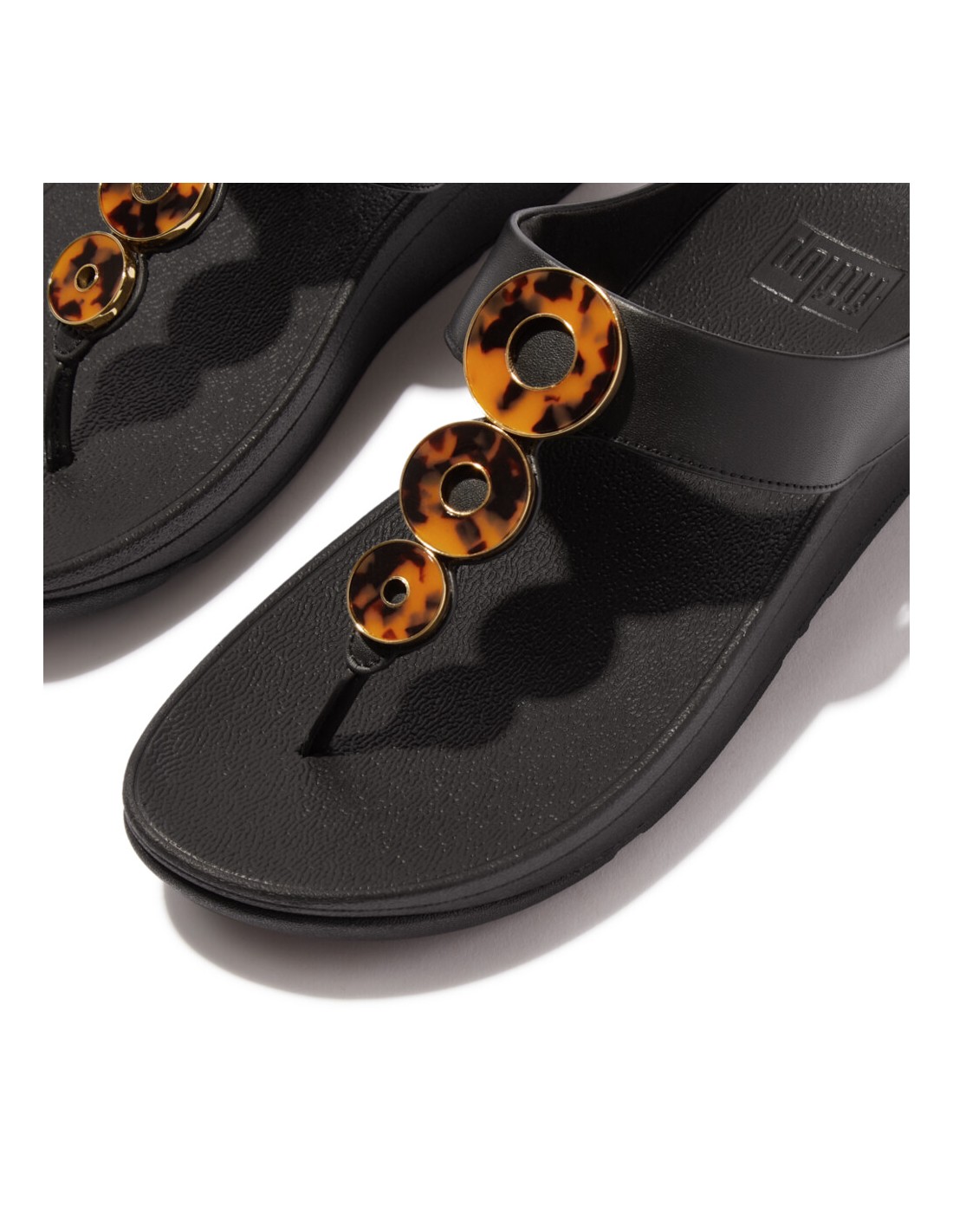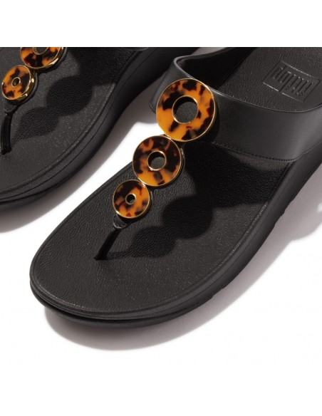 Descripción: Cómoda chancla mujer FITFLOP FINO RESIN-HOOP TOE-POST entre dedos en suave piel negra con detalle pedrería. Tecnología de entresuela Microwobbleboard amortiguadora, que ayuda a difundir la presión.