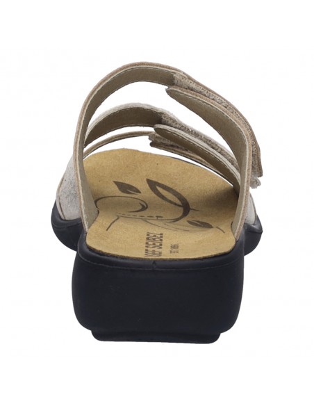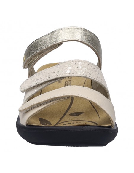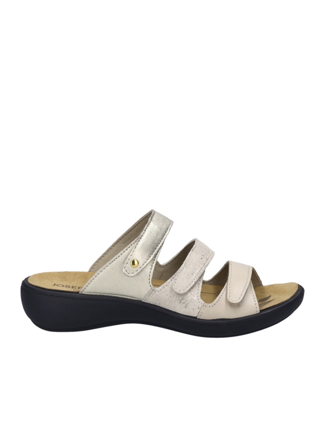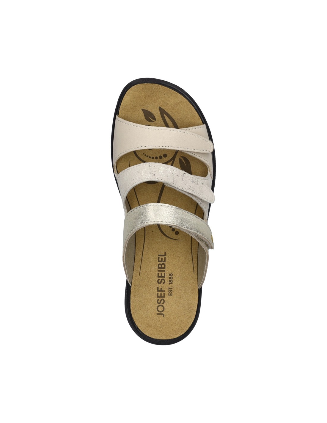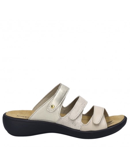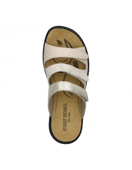 Descripción: Chancla mujer de Josef Seibel IBIZA-10 en suave piel beig-oro. Ajuste con velcros. Planta anatómica extraible. Piso de poliuretano inyectado ligero y con dibujo antideslizante.
