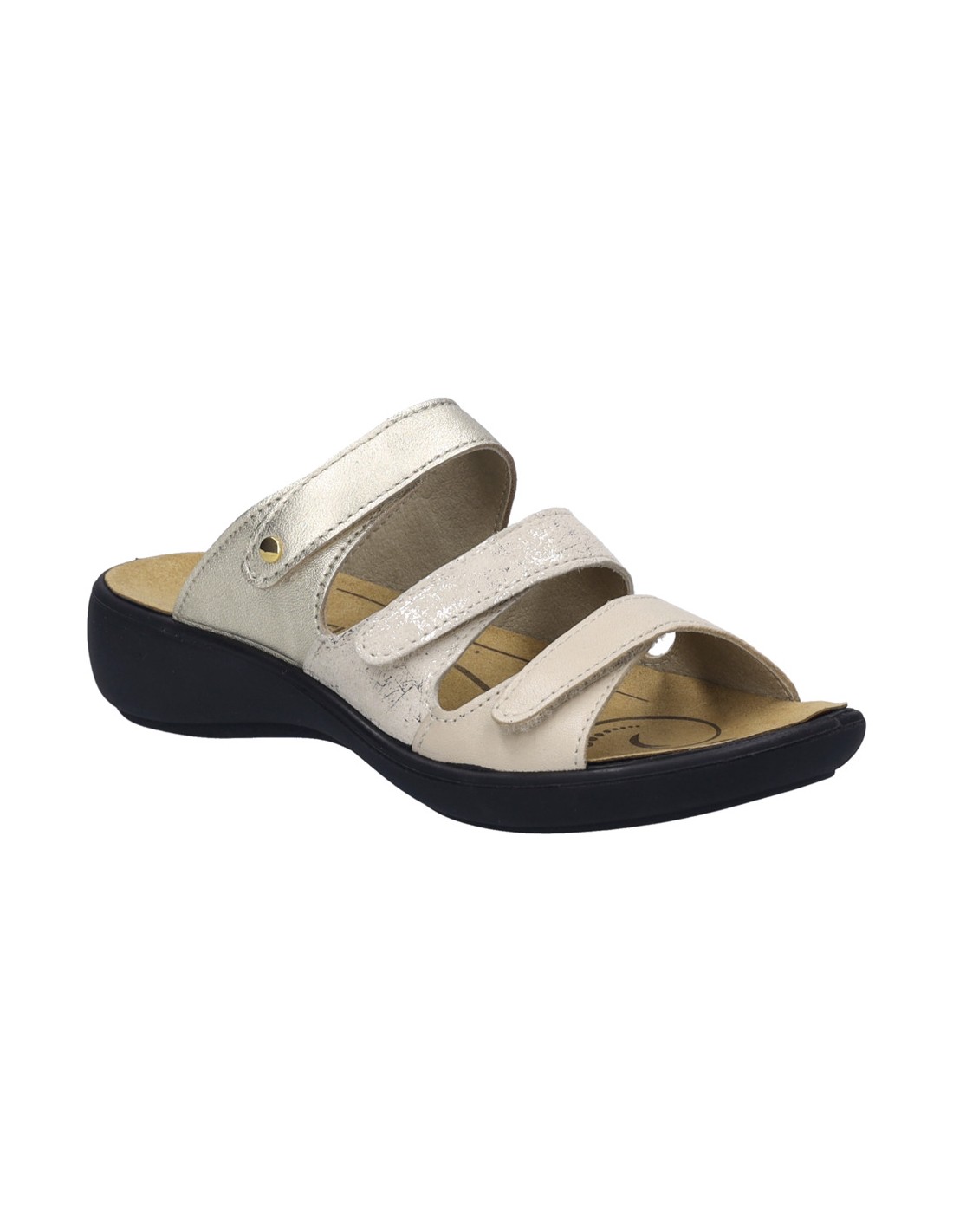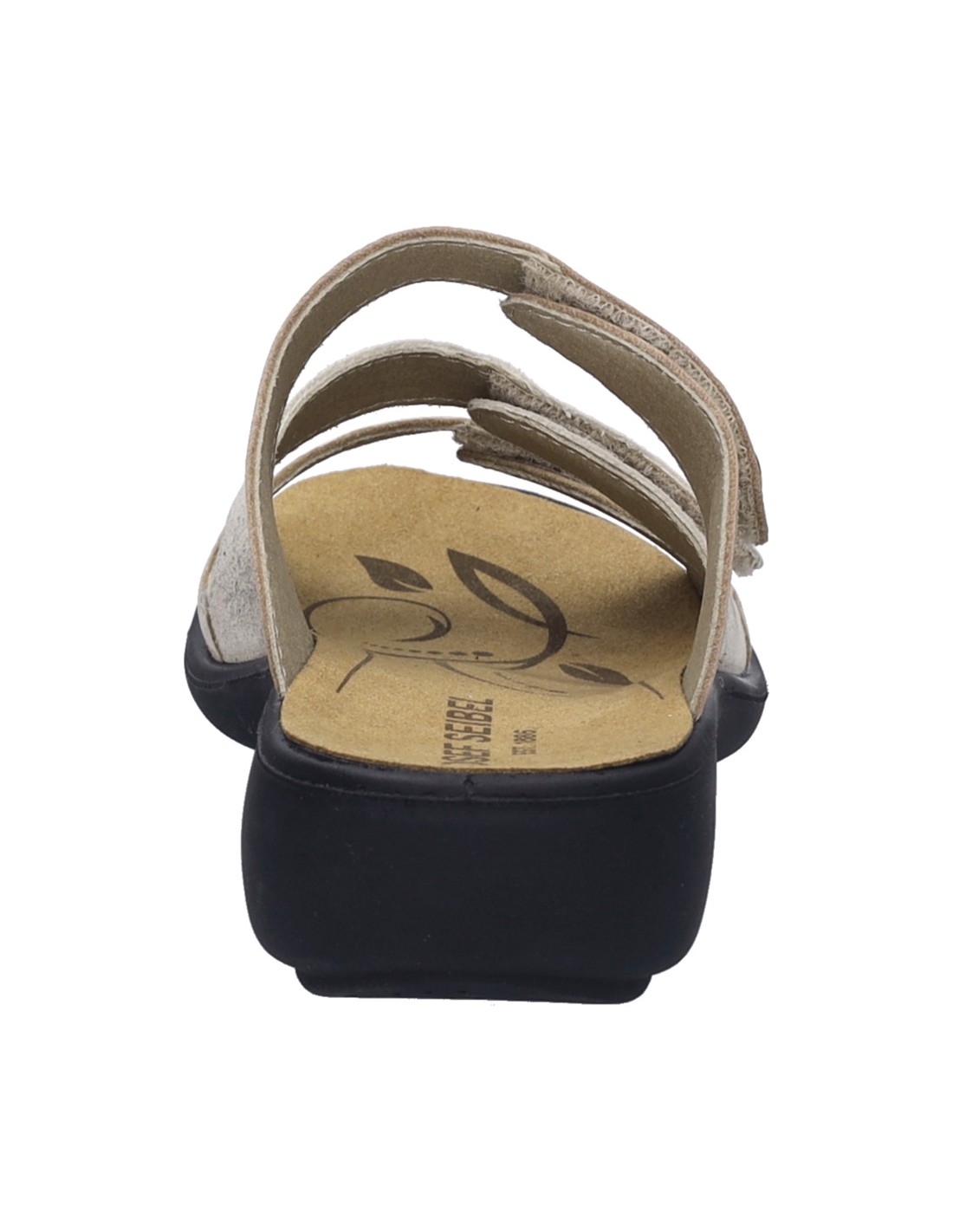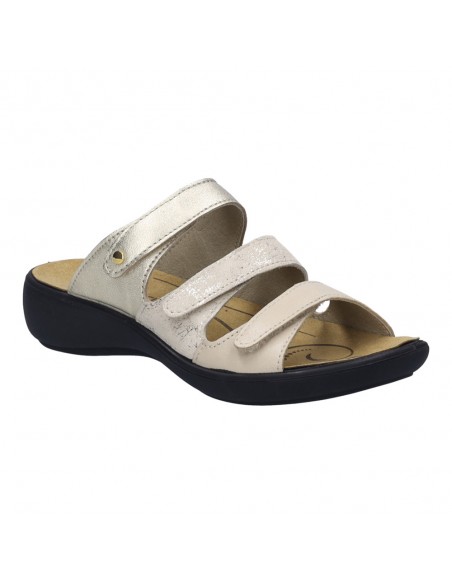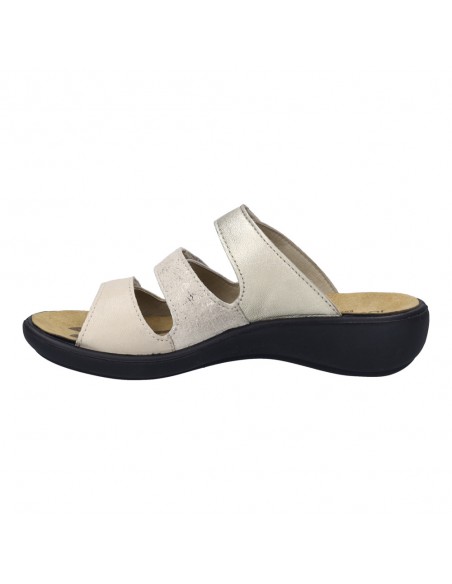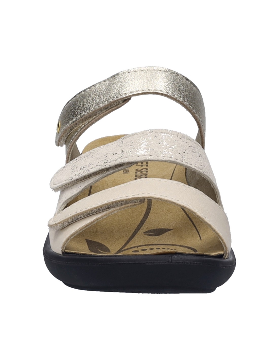 Descripción: Chancla mujer de Josef Seibel IBIZA-10 en suave piel beig-oro. Ajuste con velcros. Planta anatómica extraible. Piso de poliuretano inyectado ligero y con dibujo antideslizante.