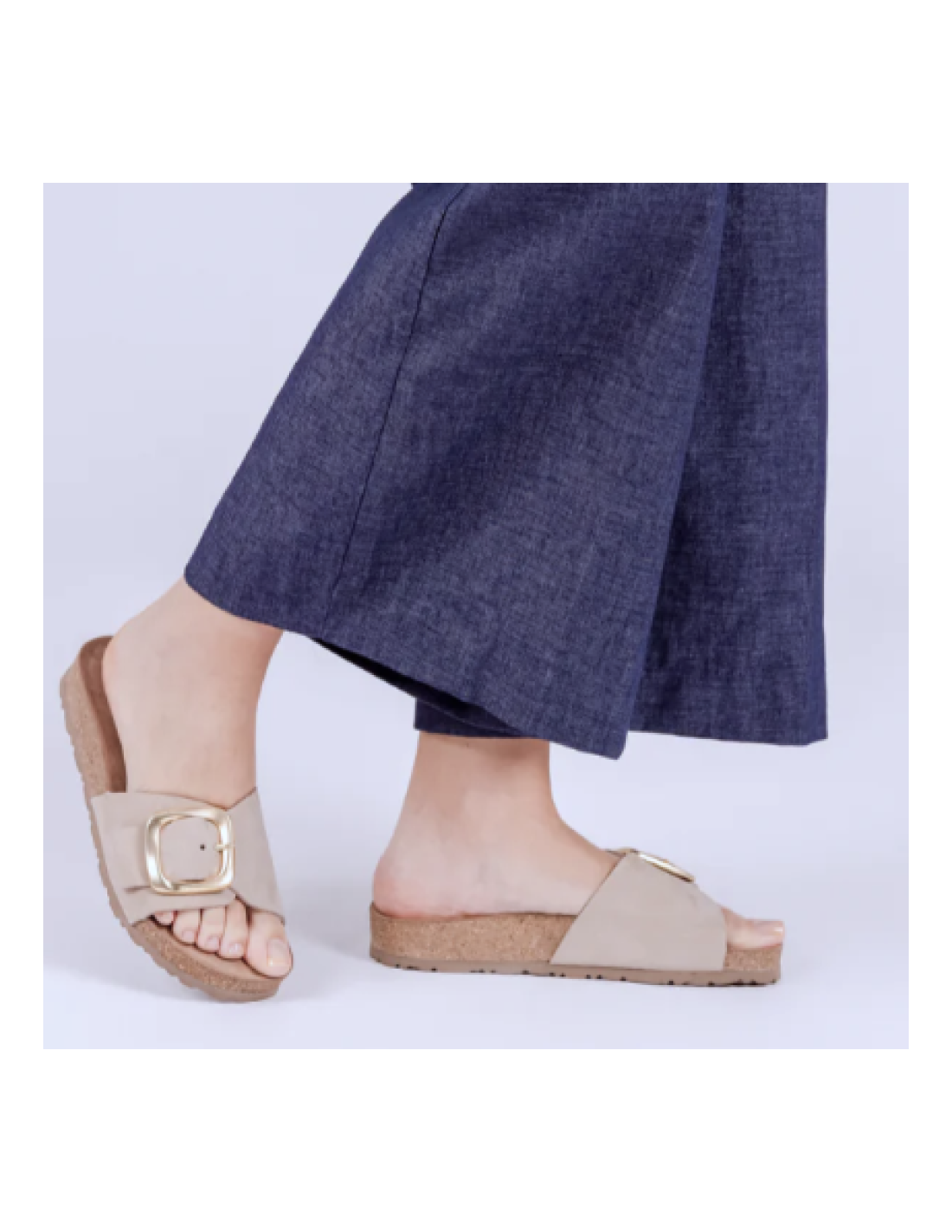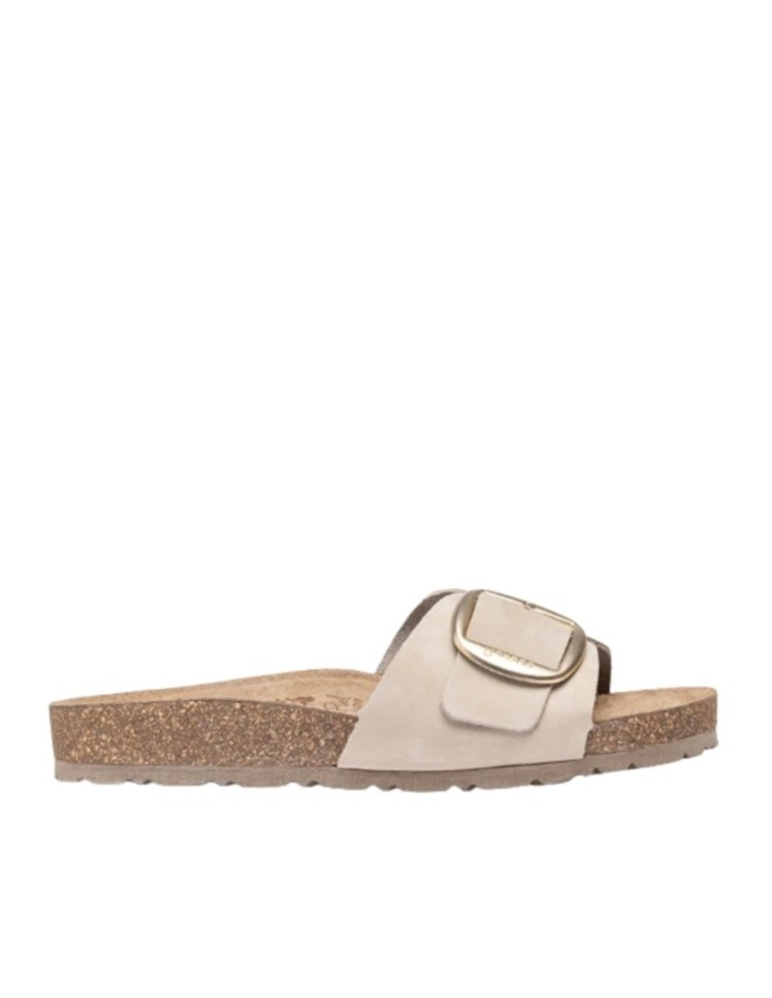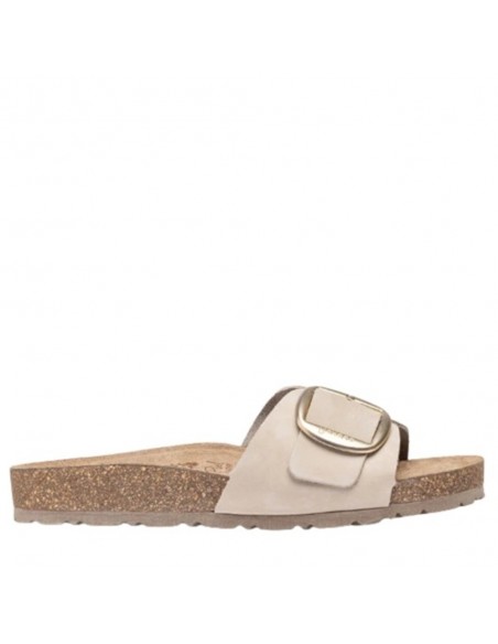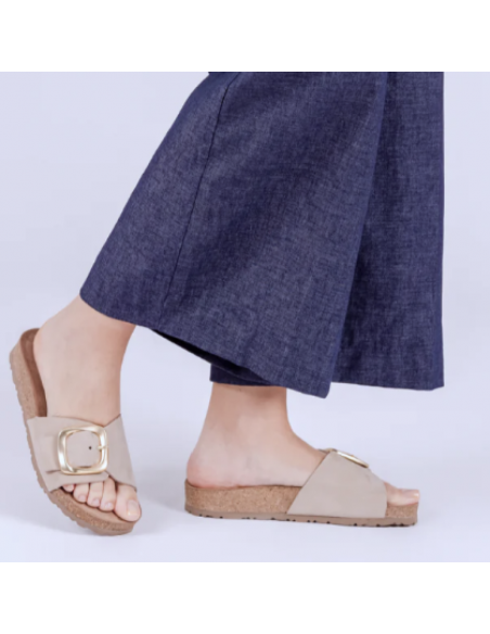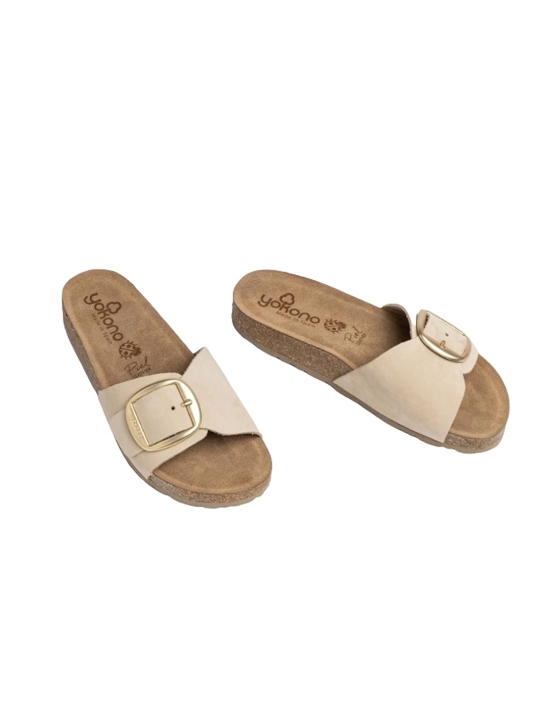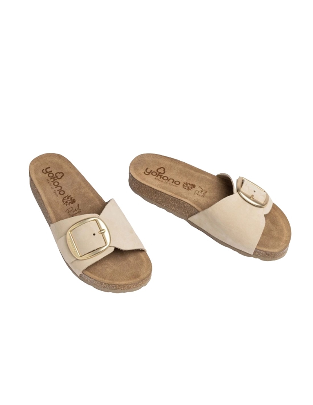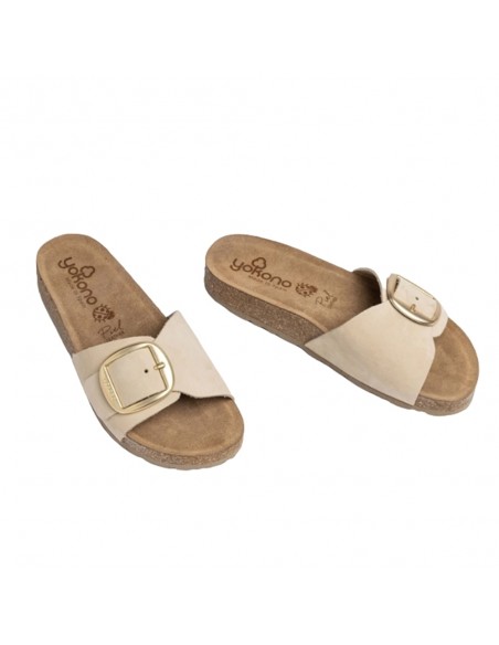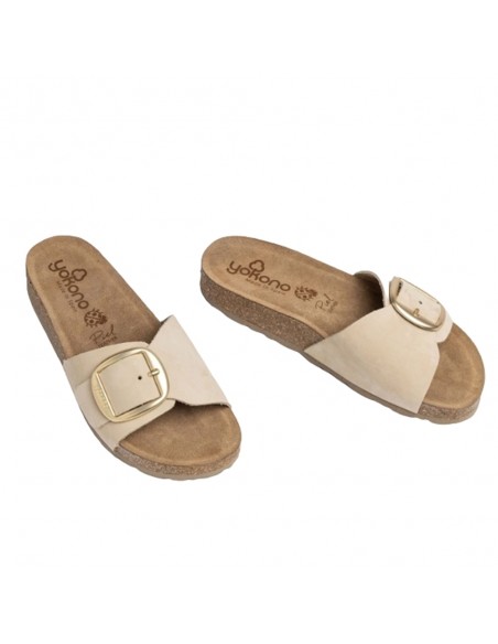 Descripción: Chancla mujer estilo BIO JERBA-114 de YOKONO. Fabricación artesana en piel beig con tintes vegetales. Tira con hebilla dorada ajustables. Plantilla en piel acolchada. Cuña ligera con plataforma con piso antideslizante.