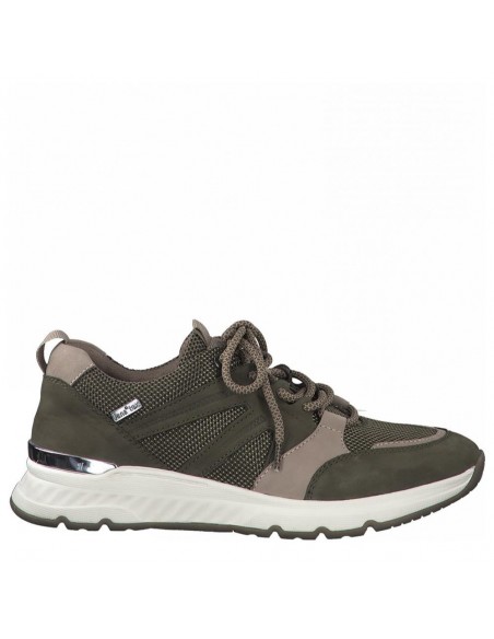 Descripción: Deportiva mujer 23727 de Jana en malla y refuerzos en piel kaki y beig. Membrana impermeable. Plantilla anatómica móvil. Cómoda cuña pet reciclada blanca antideslizante y amortiguadora.