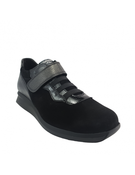 Descripción: Deportiva ancho especial 8406-1 de CalzaFarma en nubuck negro y detalles metalizados. Ajuste velcro y cordones elásticos. Plantillla extraible antibacteriana con planta de gel para una óptima amortiguación,