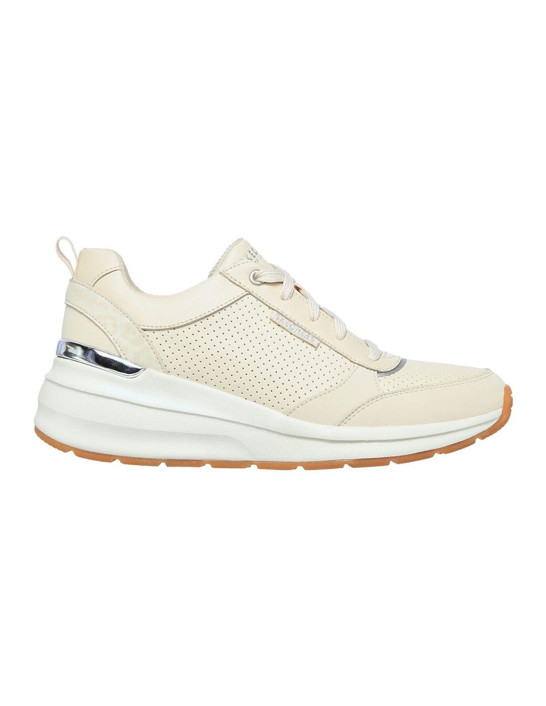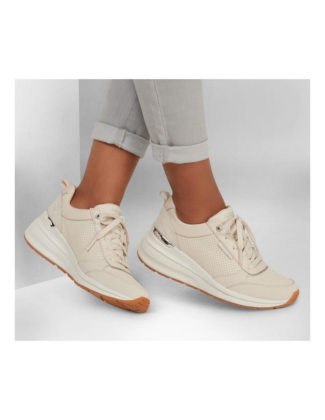 Descripción: Deportiva mujer BILLION - SUBTLE SPOTS en tejido ofwhite aspecto piel perforado. Plantilla de confort SKECHERS Air Cooled Memory Foam® Comoda y ellegante cuña blanca con patin de goma caramelo antides