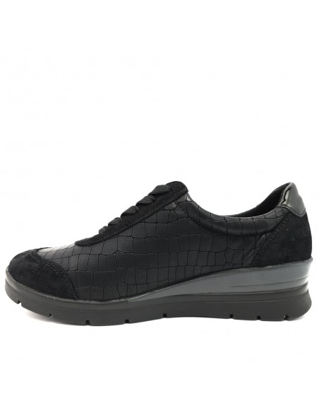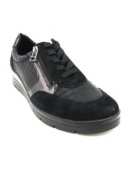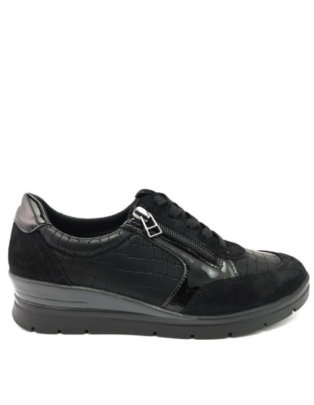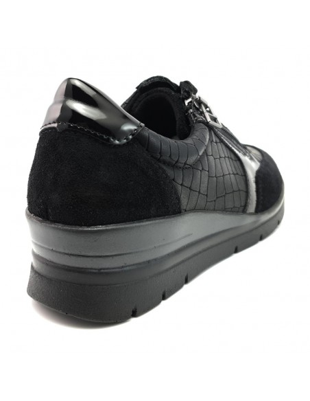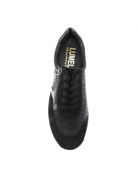 Descripción: Deportiva mujer de LUMEL LUNA-08 en piel elástica texturizada negra y refuerzos en ante negro. Cremallera lateral y cordones.Plantilla extraible. Cómodo y ligero piso antideslizante.