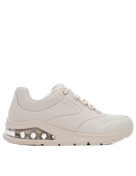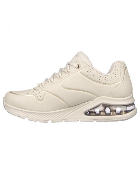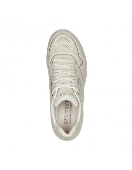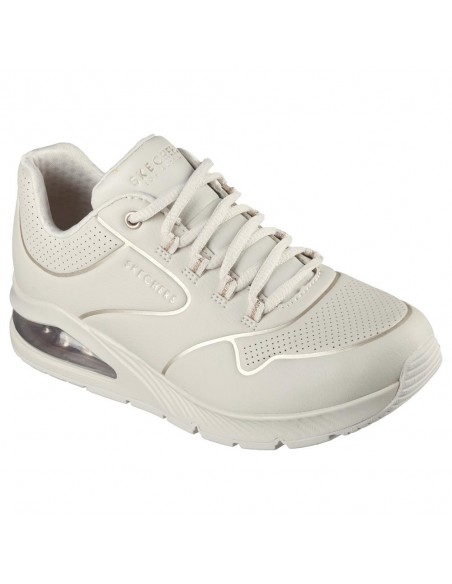 Descripción: Zapatillas urbanas de mujer Skechers UNO AIR - GOLDEN TRIM con entresuela de aire que proporciona amortiguación perfecta. En suave tejido ofwhite con textura de piel y perforaciones. Piso al tono.