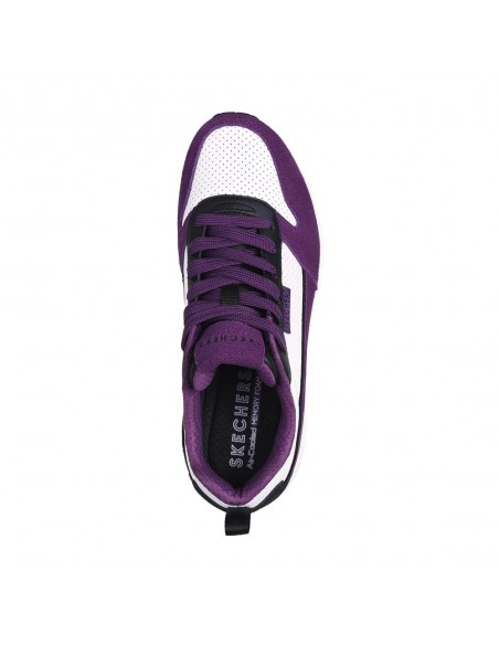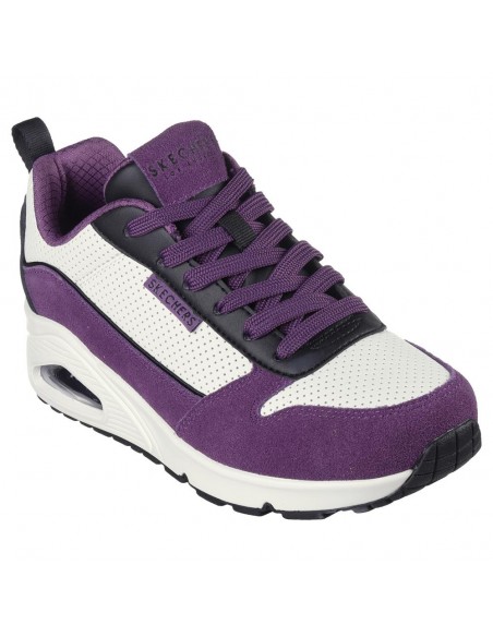 Descripción: Zapatillas urbanas de mujer Skechers UNO AIR TWO MUCH FUN con entresuela de aire que proporciona amortiguación perfecta. En suave tejido blanco con refuerzos en serraje morado. Piso antideslizante.