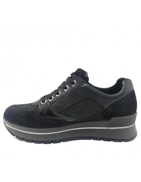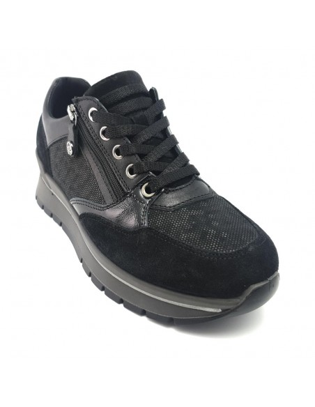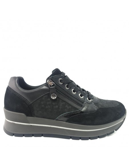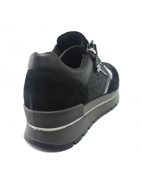 Descripción: Blucher deportivo mujer IMAC 457511 mujer en suave piel negra metalizada con refuerzos nubuck . Ajuste con cremallera. Cómodo piso de poliuretano ligero y antideslizante. Elegante y cómoda todo el día.
