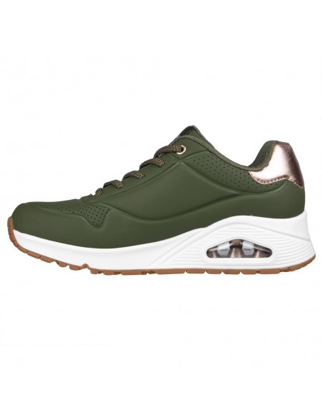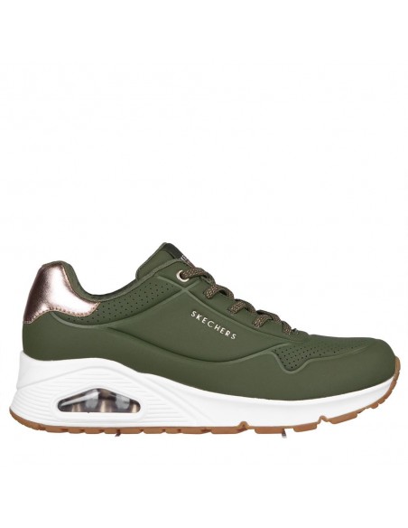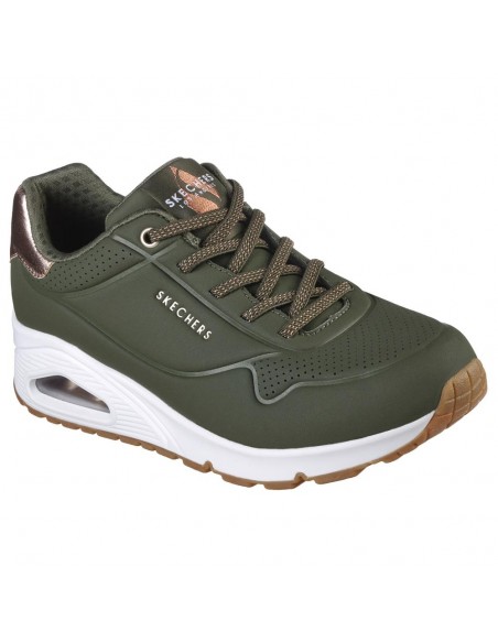 Descripción: Deportivas urbanas de mujer Skechers UNO STAND ON AIR con entresuela de aire que proporciona amortiguación perfecta. En suave tejido kaki con textura de piel con perforaciones y detalles oro.