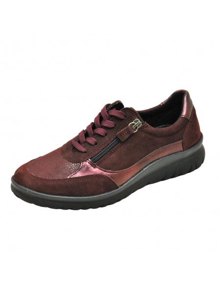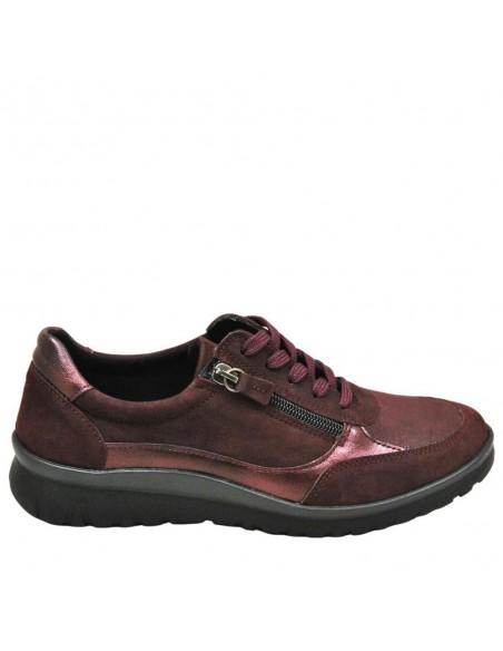 Descripción: Deportiva mujer de LUMEL DAHLI-09 en piel elástica aspecto metalizada burdeos y refuerzos en nubuck burdeos. Cremallera lateral y cordones.Plantilla extraible. Cómodo y ligero piso antideslizante.