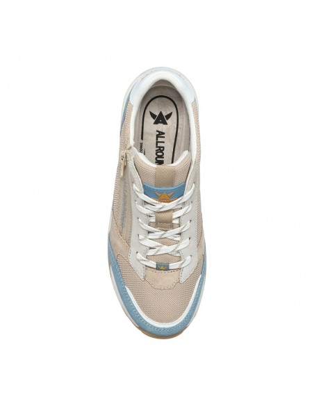 Descripción: Deportiva mujer Alrrounder VENICE en naylon beig y refuerzos piel azul. Sistema SHOCK-ABSORBER de óptima amortiguación. Diseño moderno de gran adaptabilidad, resistencia y comodidad. Cremallera lateral.