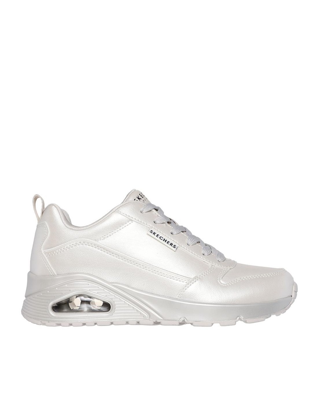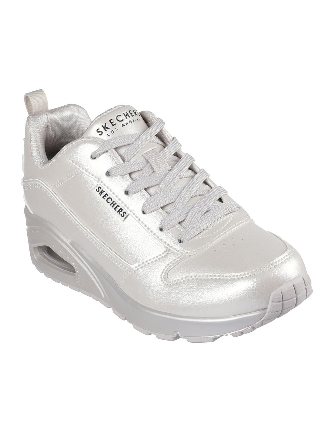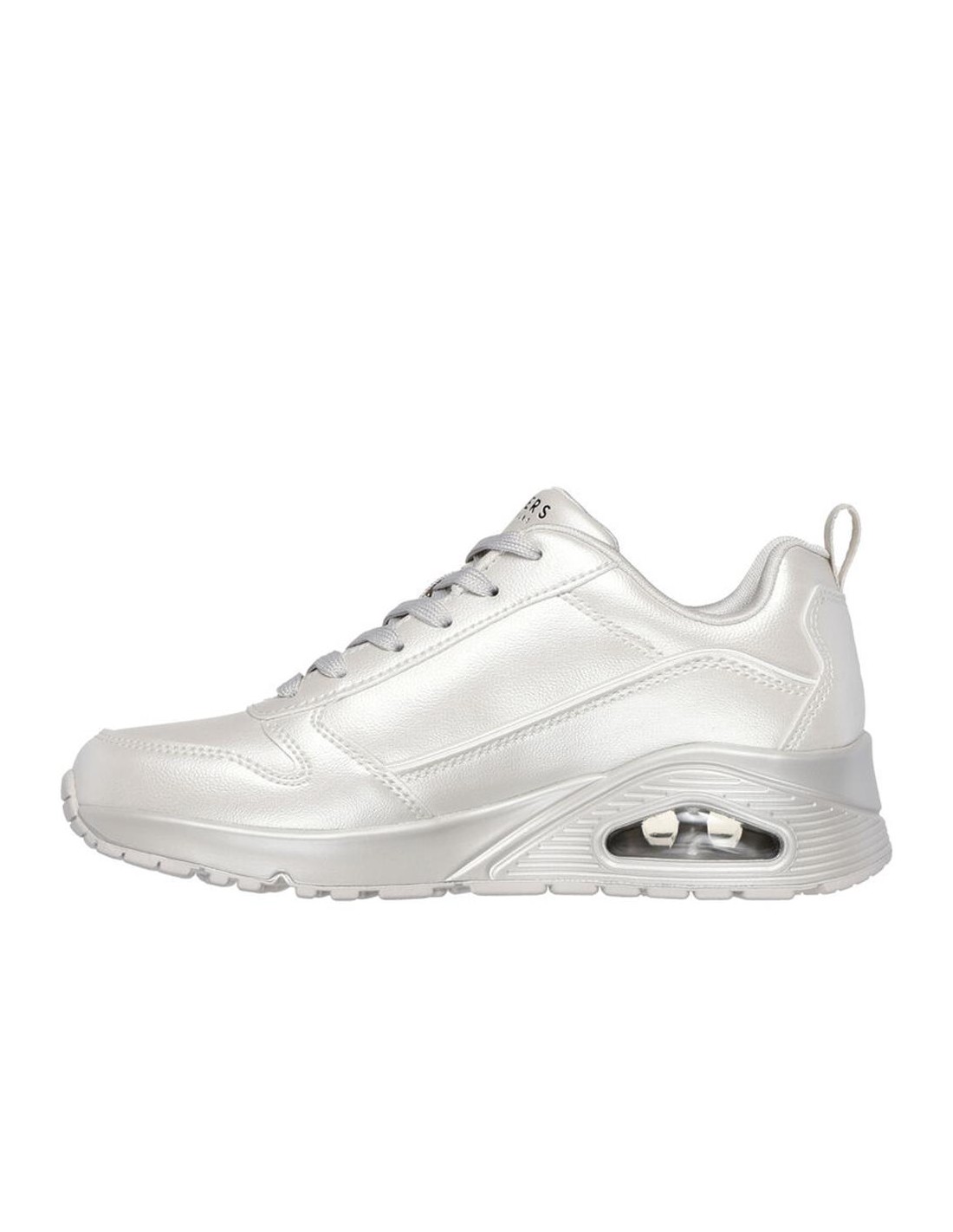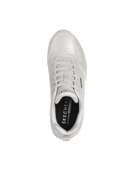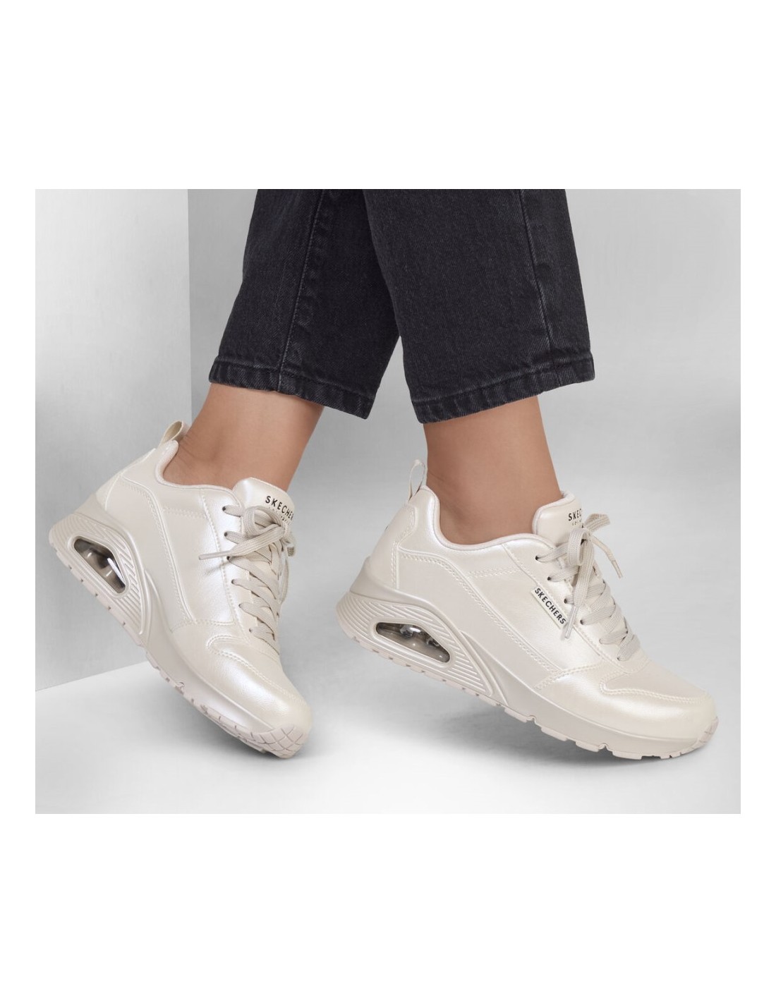 Descripción: Deportiva urbana de mujer Skechers UNO AIR GALACTIC GAL con entresuela de aire SKECH-AIR amortiguadora. Tejijo offwhite metalizado de aspecto piel lisa. Plantilla Air Coled Memory Foam. Piso de goma antideslizante.
