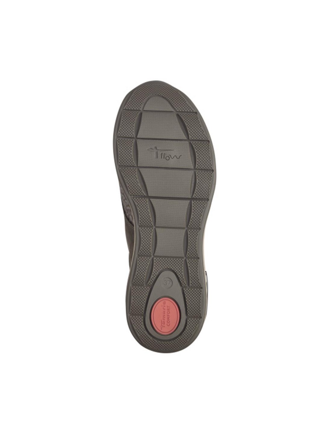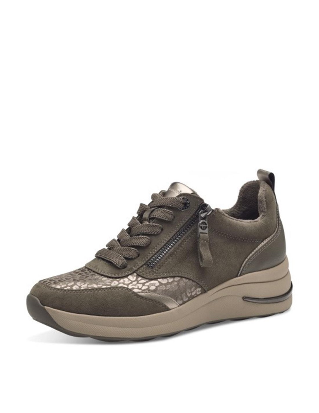 Descripción: Deportiva mujer 83714 de TAMARIS CONFORT en nubuck y licra adaptable taupe-oro. Plantilla anatómica extraible. Ajuste cremallera y cordones. Cómodo piso flexible con tecnología TFlow amortiguadora.