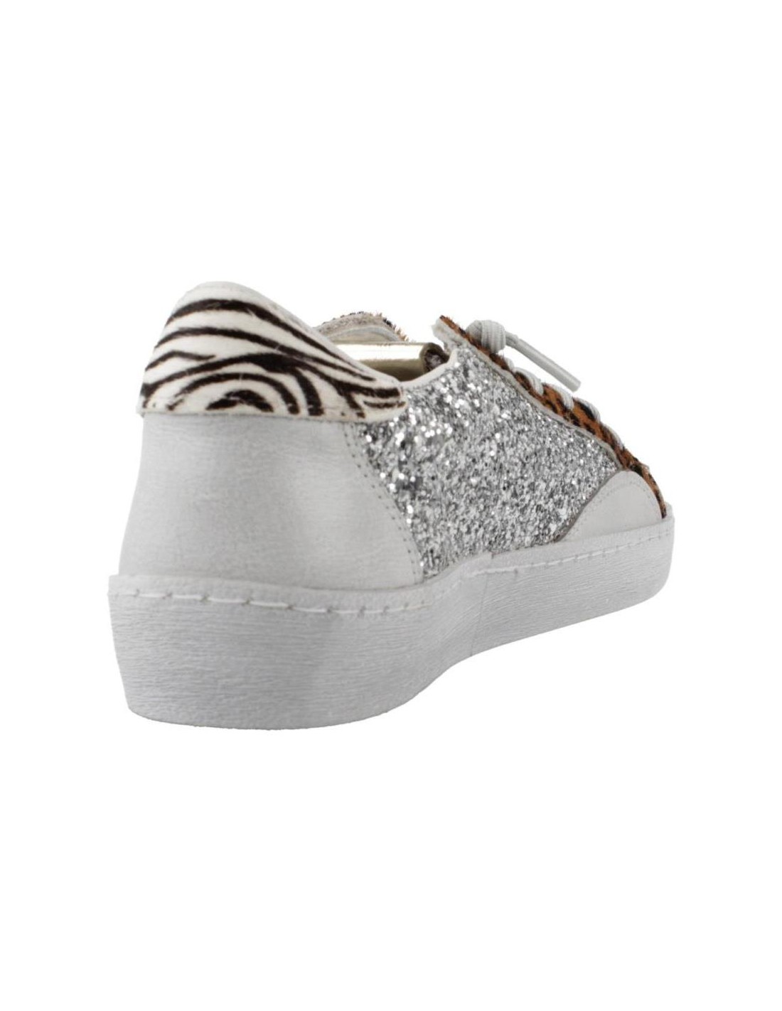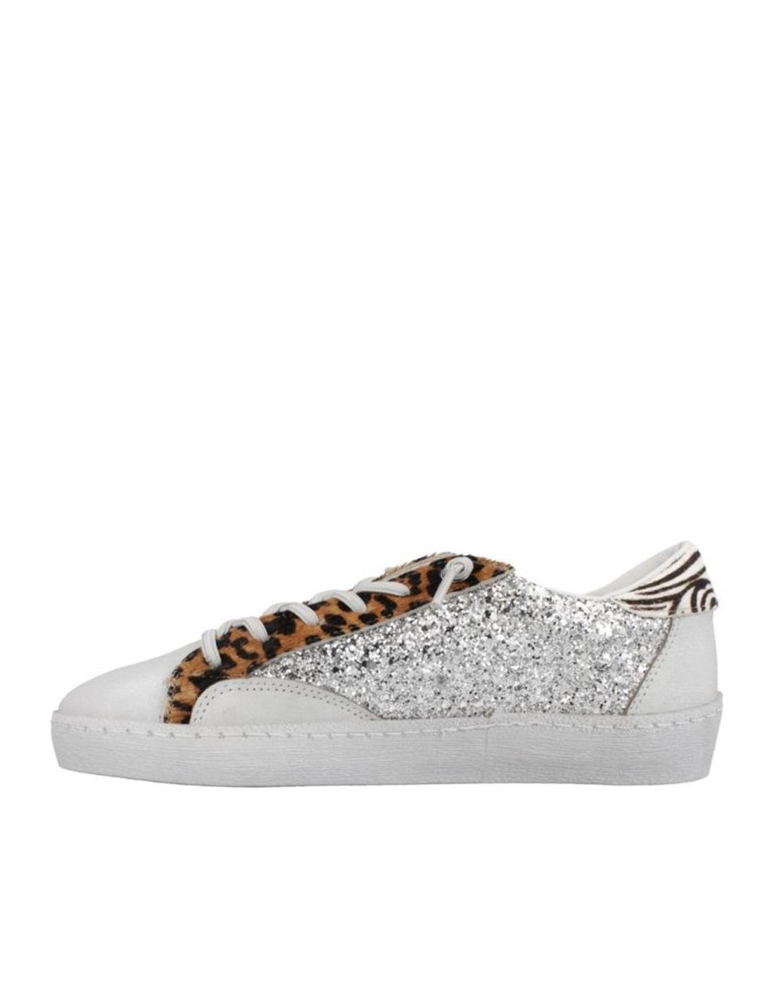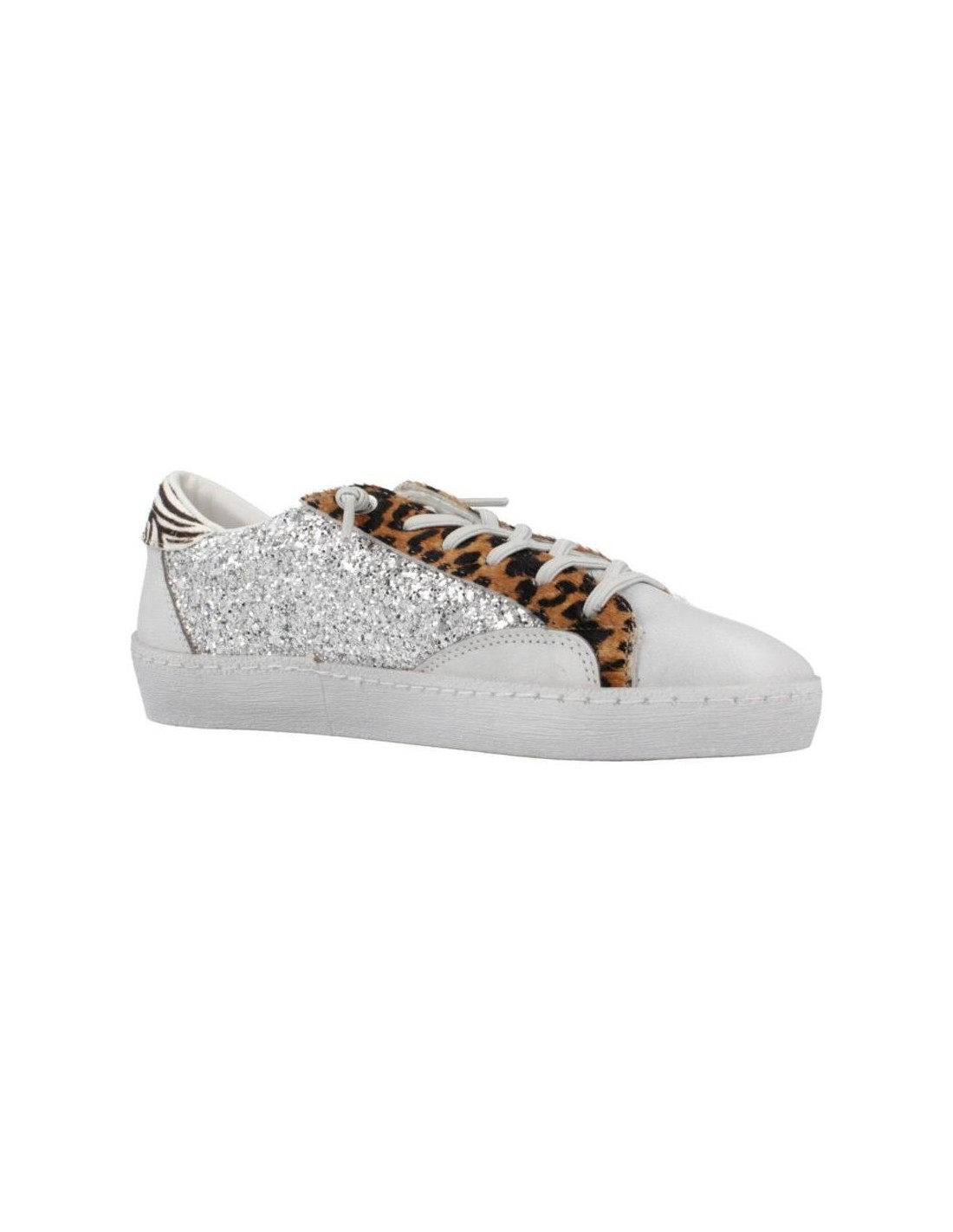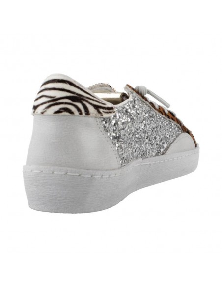 Descripción: Deportiva mujer 1342 de CETTI en piel beig y glitter con logo oro y detalles animal-print. Cordones elásticos. Plantilla extraible acolchada. Ligera plataforma con acabado envejecido.