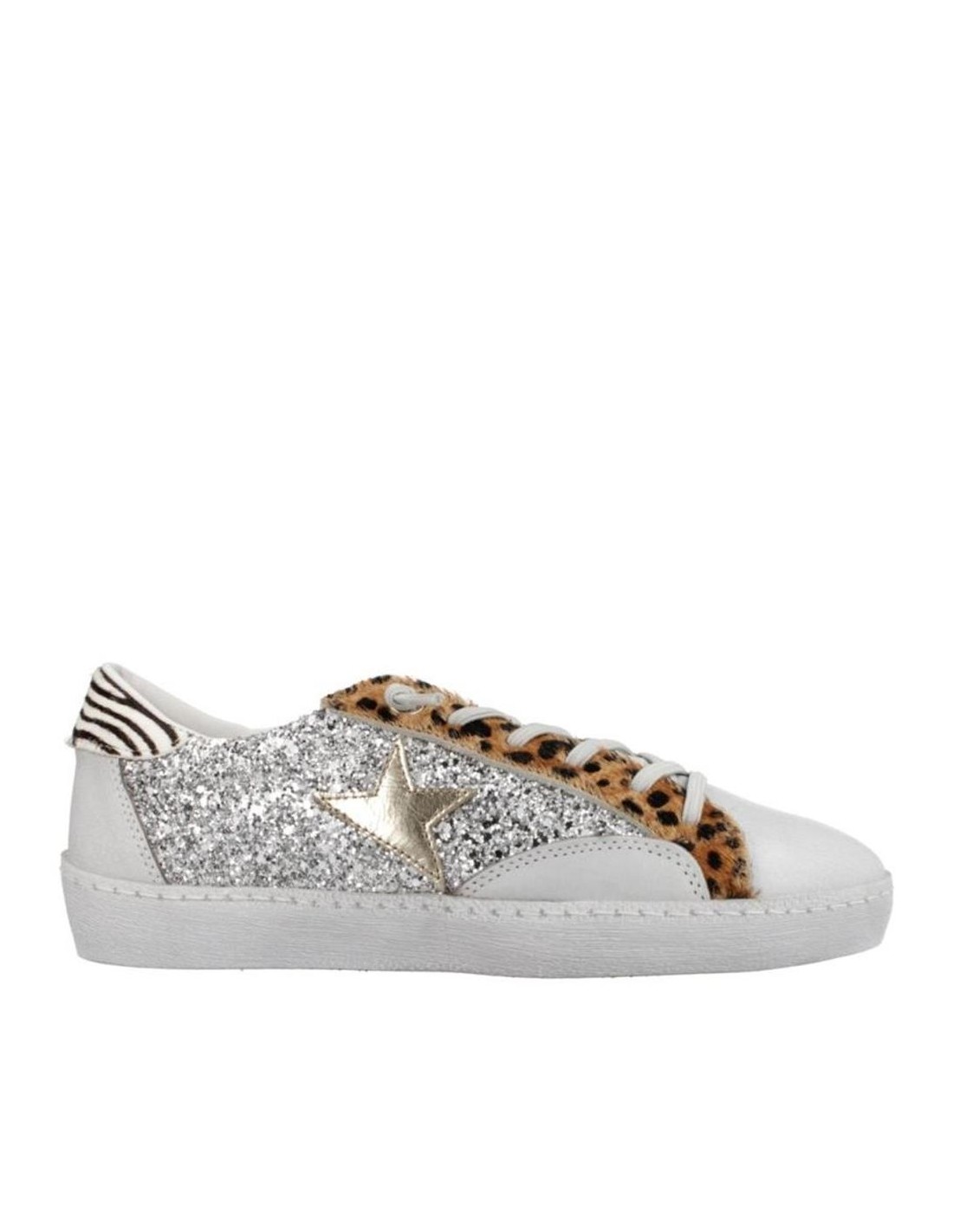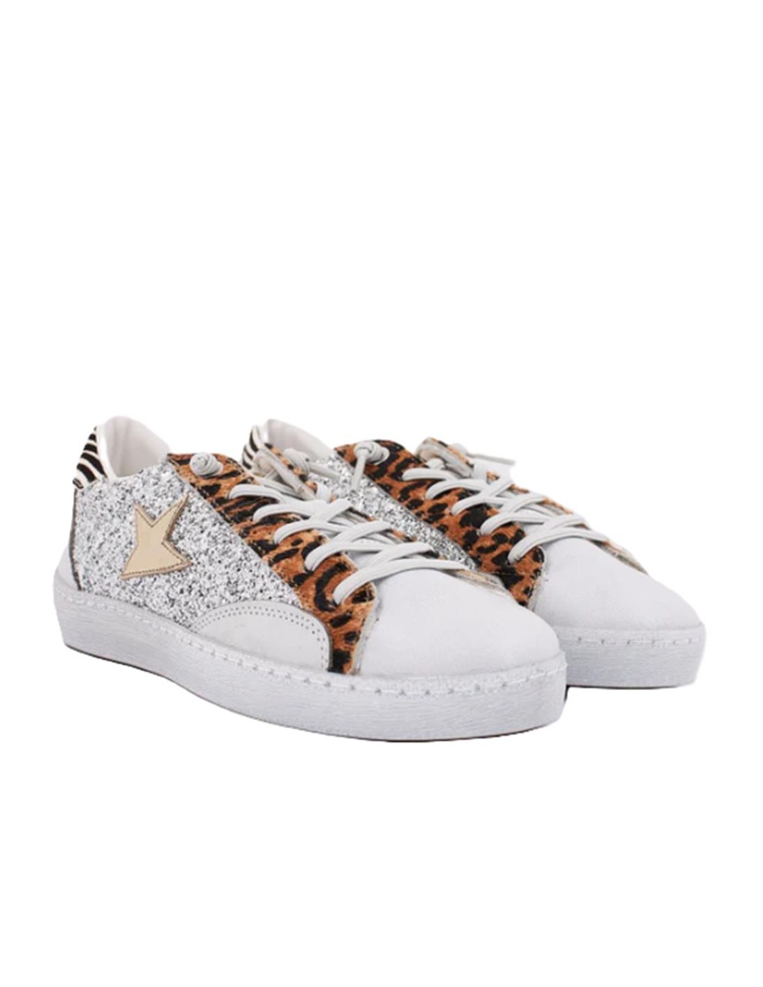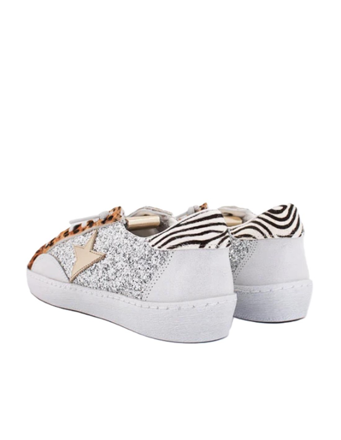 Descripción: Deportiva mujer 1342 de CETTI en piel beig y glitter con logo oro y detalles animal-print. Cordones elásticos. Plantilla extraible acolchada. Ligera plataforma con acabado envejecido.