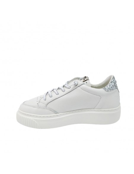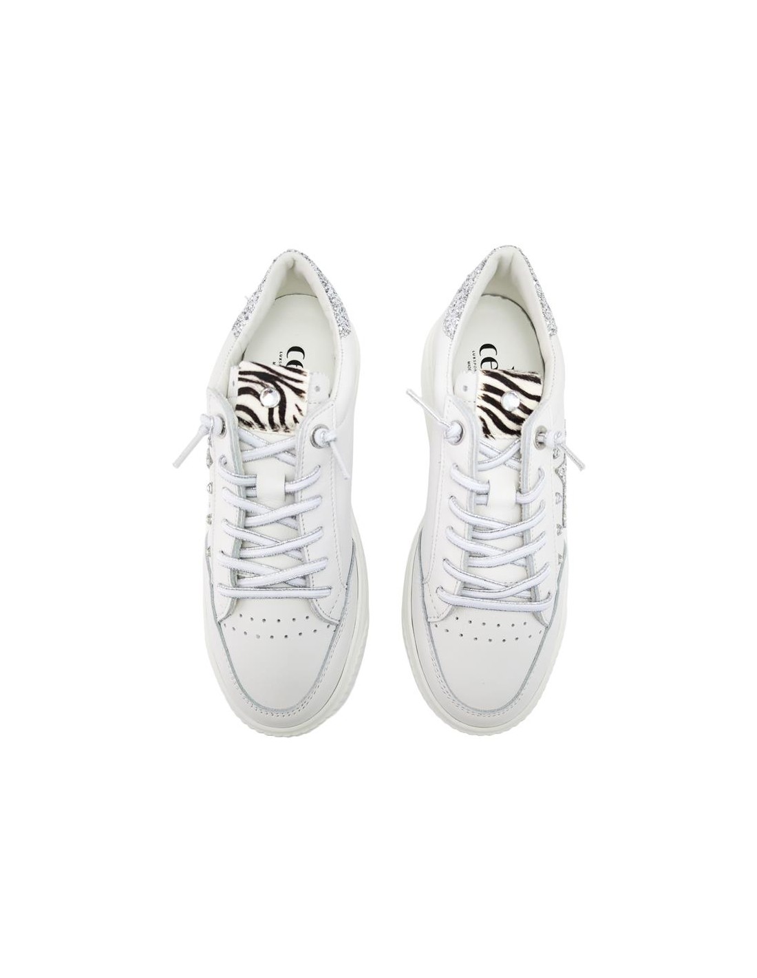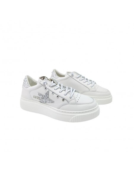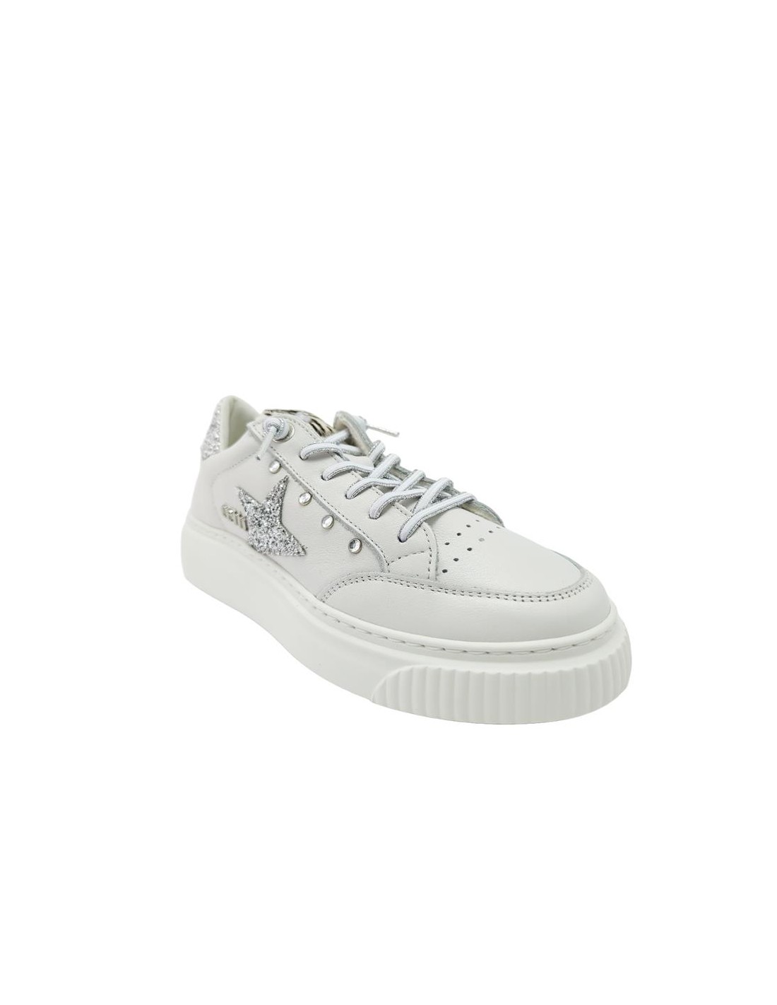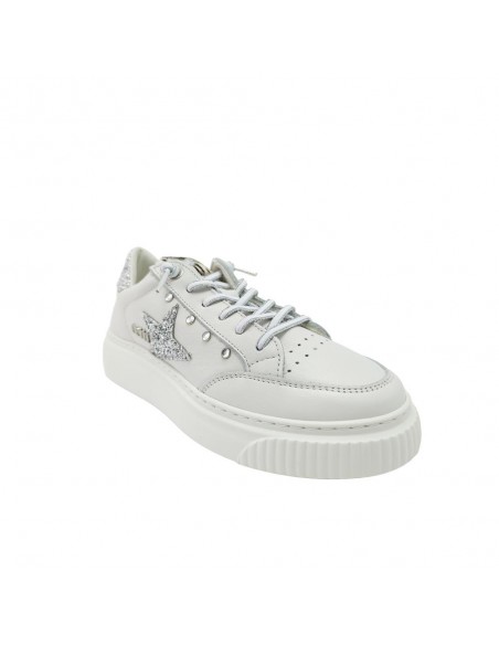 Descripción: Deportiva mujer 1320 de CETTI en piel grabada blanca con detallede tachas y logo estrella en plata. Cordones elásticos. Plantilla extraible acolchada. Cómoda y ligera plataforma.