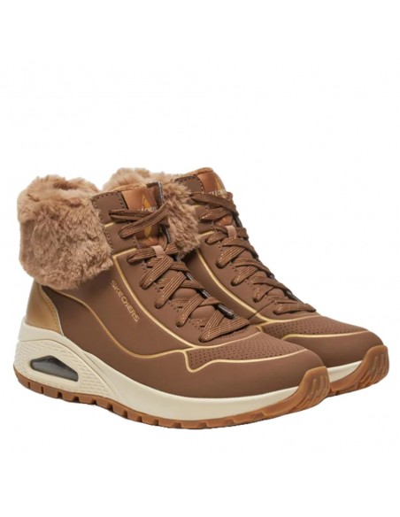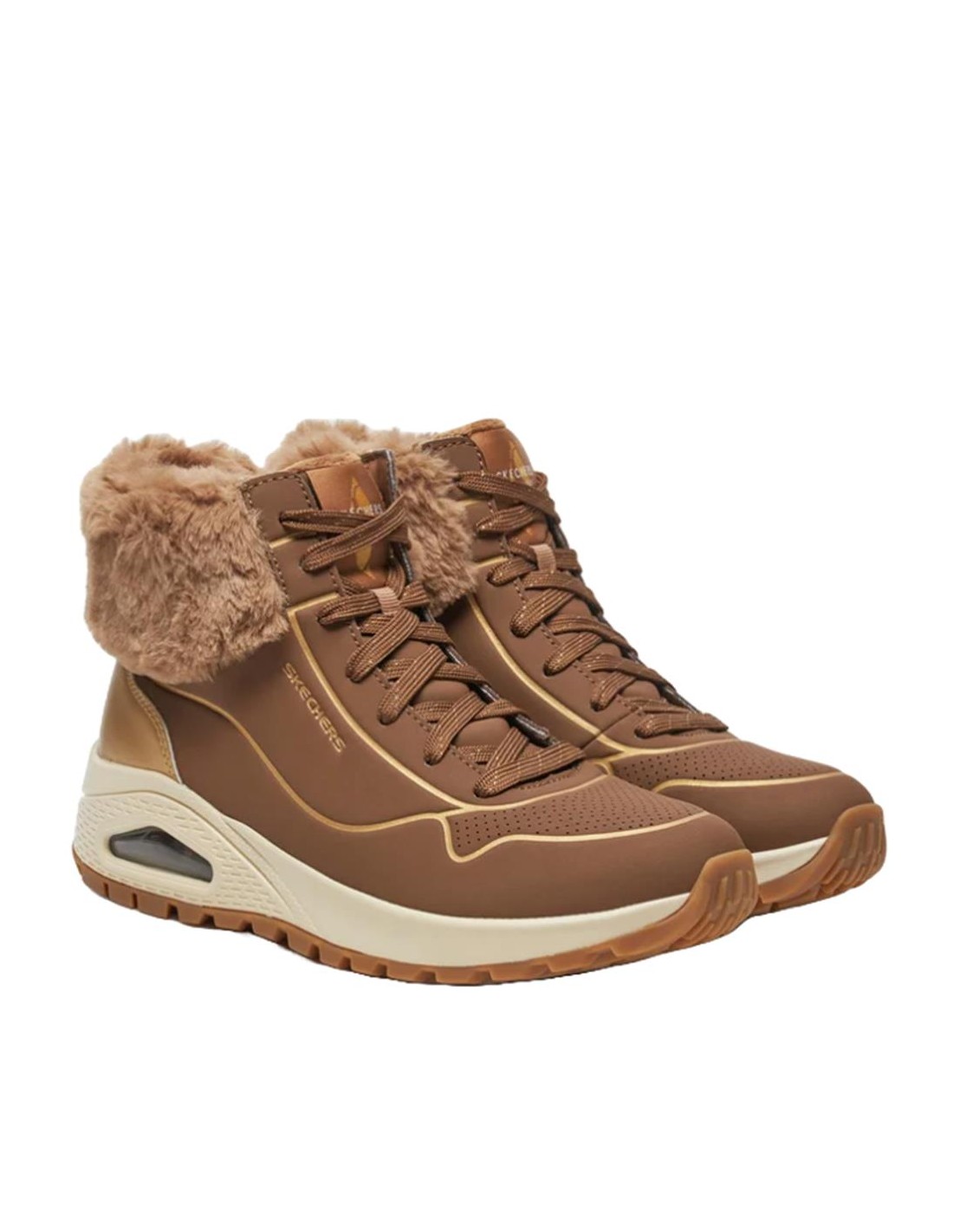 Descripción: Deportiva urbana abotinada de mujer Skechers UNO RUGGED - FALL SHIMMER con entresuela amortiguadora. En suave tejdo con textura de piel taupe y detalle cuello de pelo. Plantilla Air Coled Memory Foam