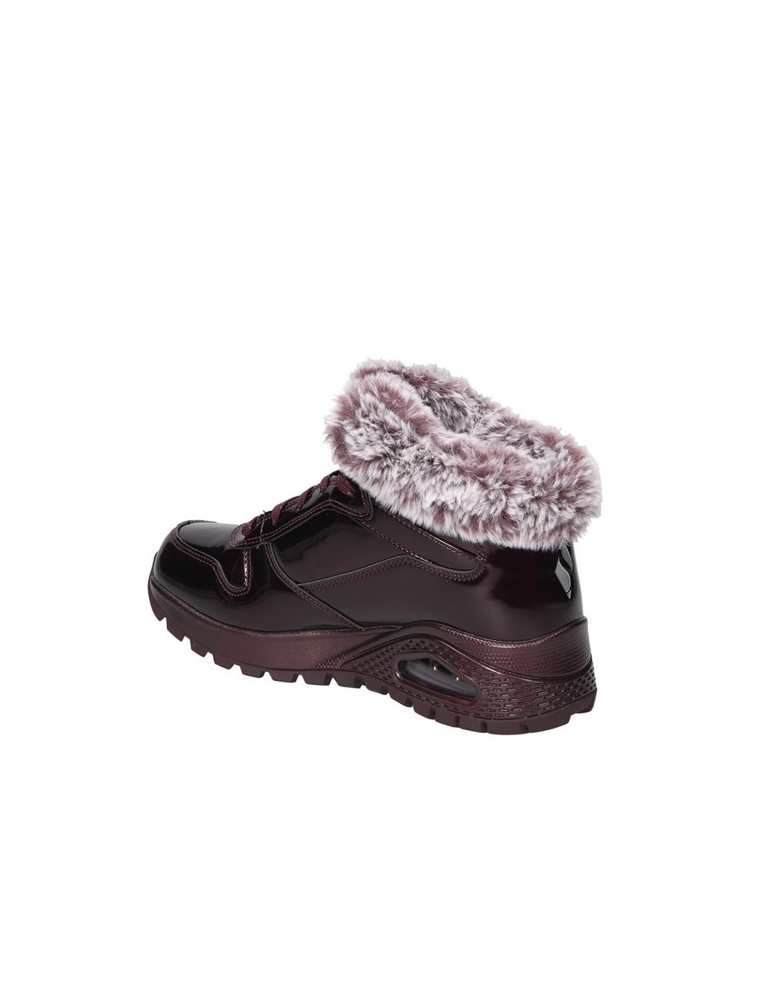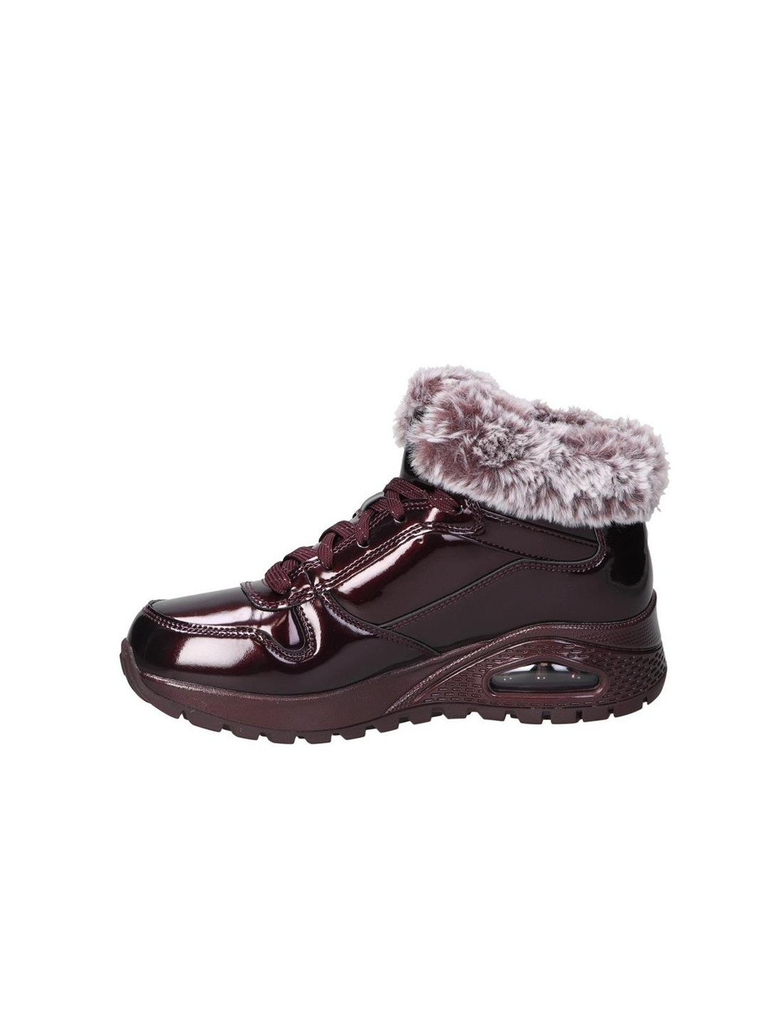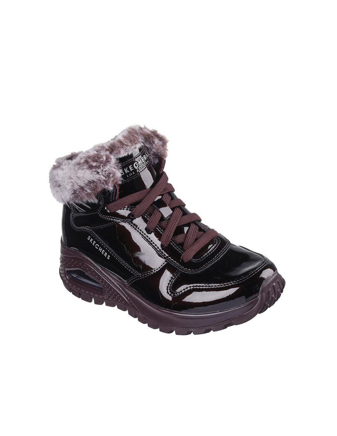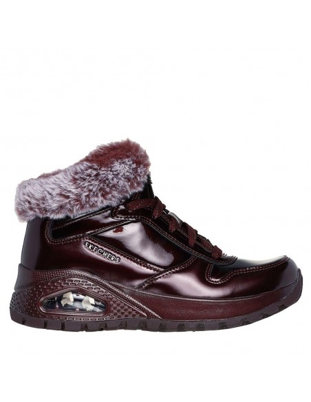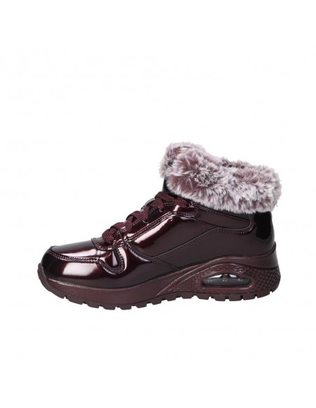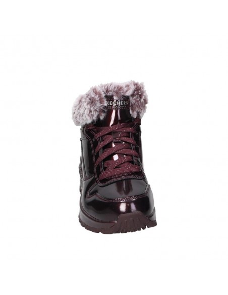Descripción: Deportiva urbana abotinada de mujer Skechers UNO FIESTY WINTER con entre suela amortiguadora. En suave charol burdeos y detalle cuello de pelo. Plantilla Air Coled Memory Foam.