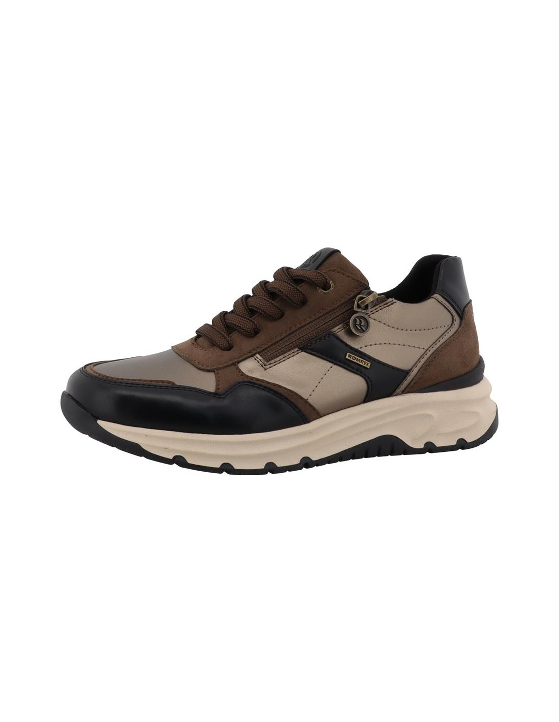 Descripción: Deportiva mujer Romika en suve polipiel mate marrón y metalizada. Membrana impermeable ROMITEX aislante y transpirable. Ajuste cordones y cremallera. Plantilla anatómica móvil. Suela cómoda, flexible y antideslizante.