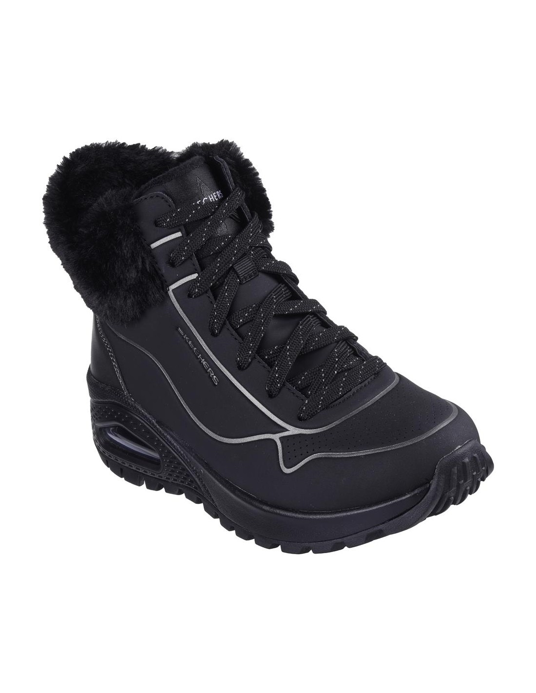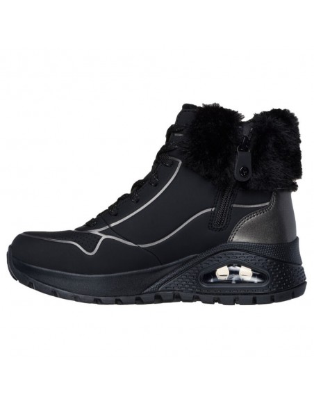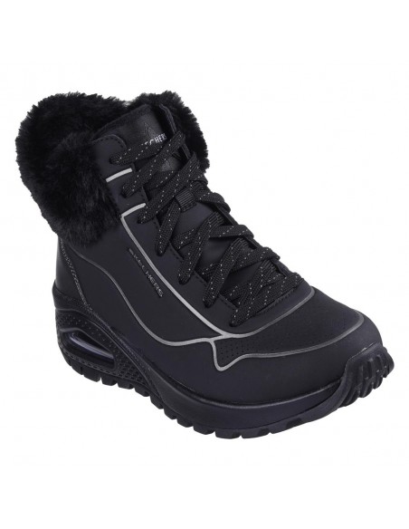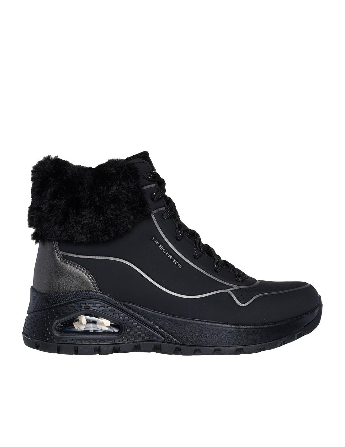 Descripción: Deportiva urbana abotinada de mujer Skechers UNO RUGGED - FALL SHIMMER con entre suela amortiguadora. En suave tejido con textura de piel negra y detalle cuello de pelo. Plantilla Air Coled Memory Foam