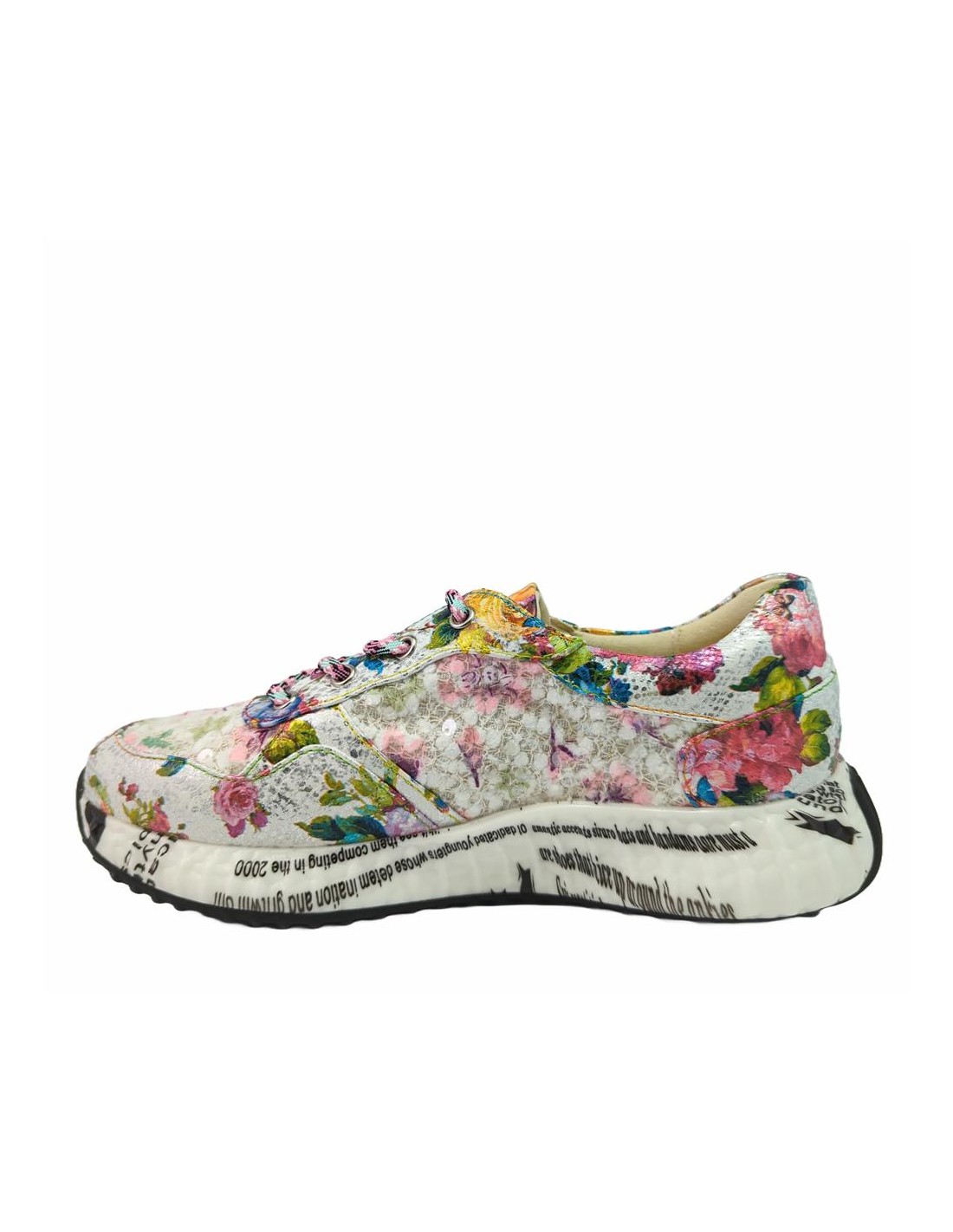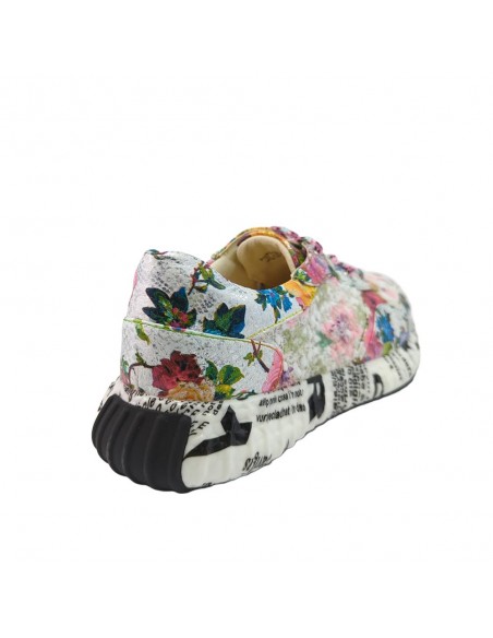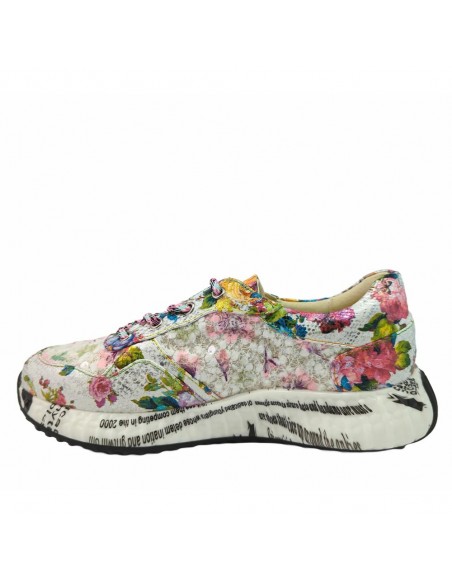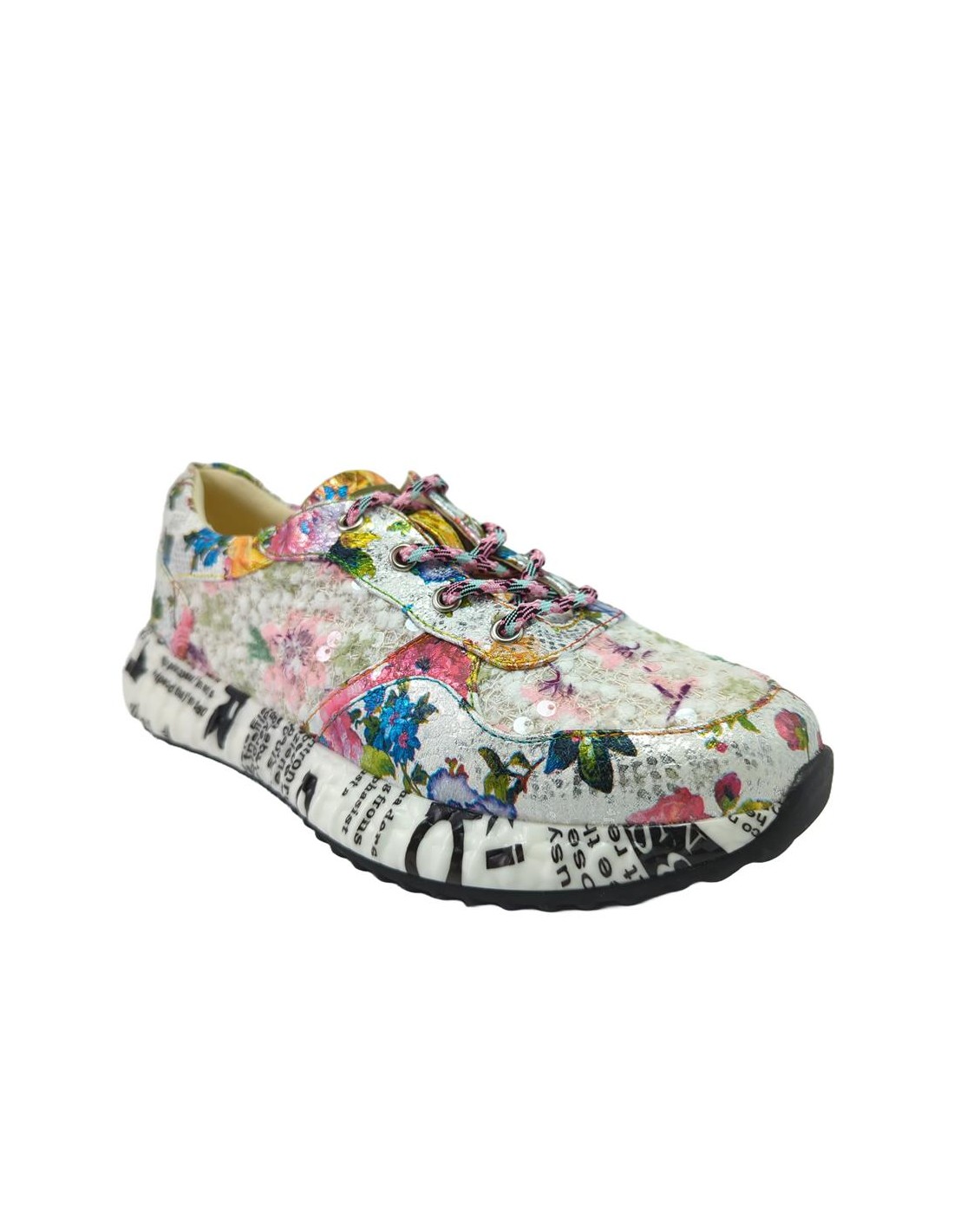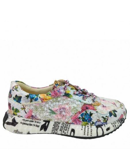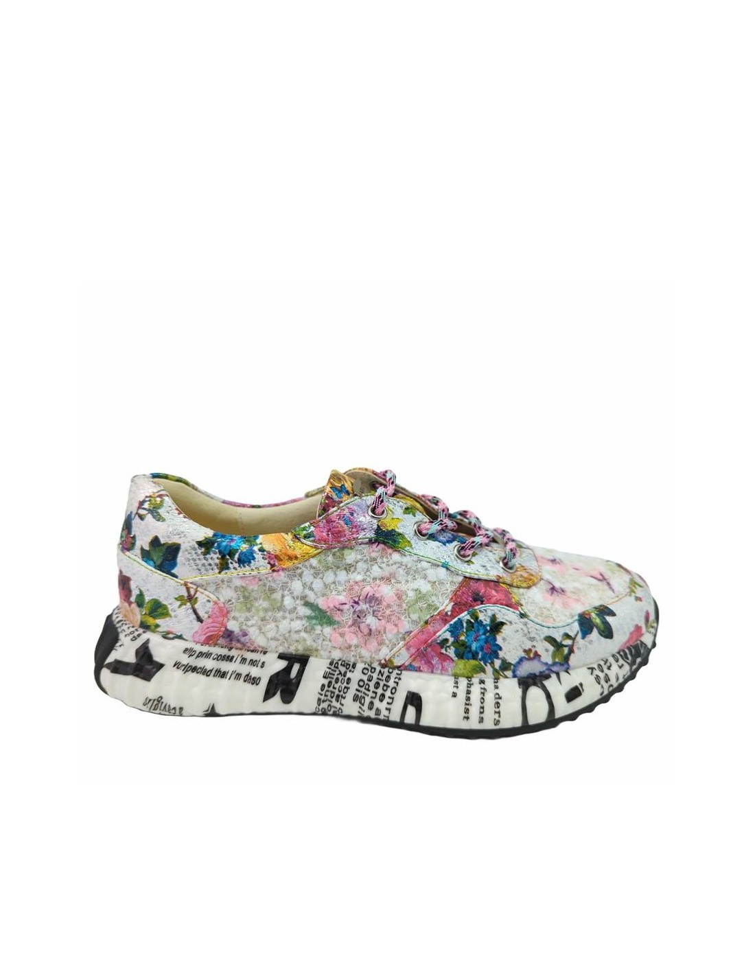 Descripción: Deportiva mujer Laura Vita BURTON-05 en piel con motivos florales sobre tejido blanco. Esta marca ofrece originalidad inspirada en la naturaleza y las artes, colorido nuevo cada temporada y comodidad.