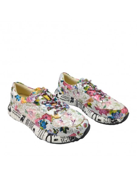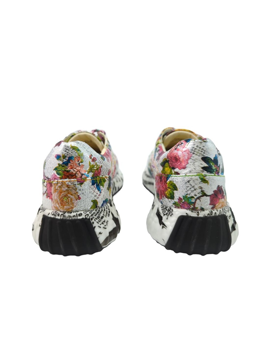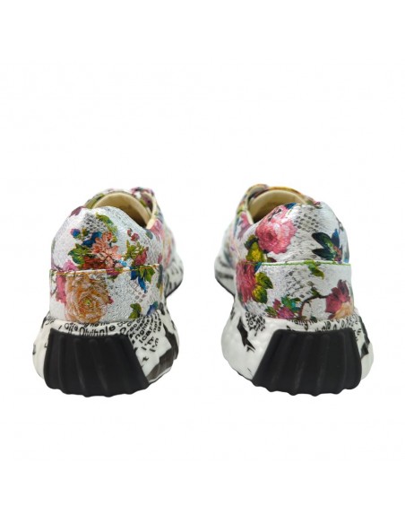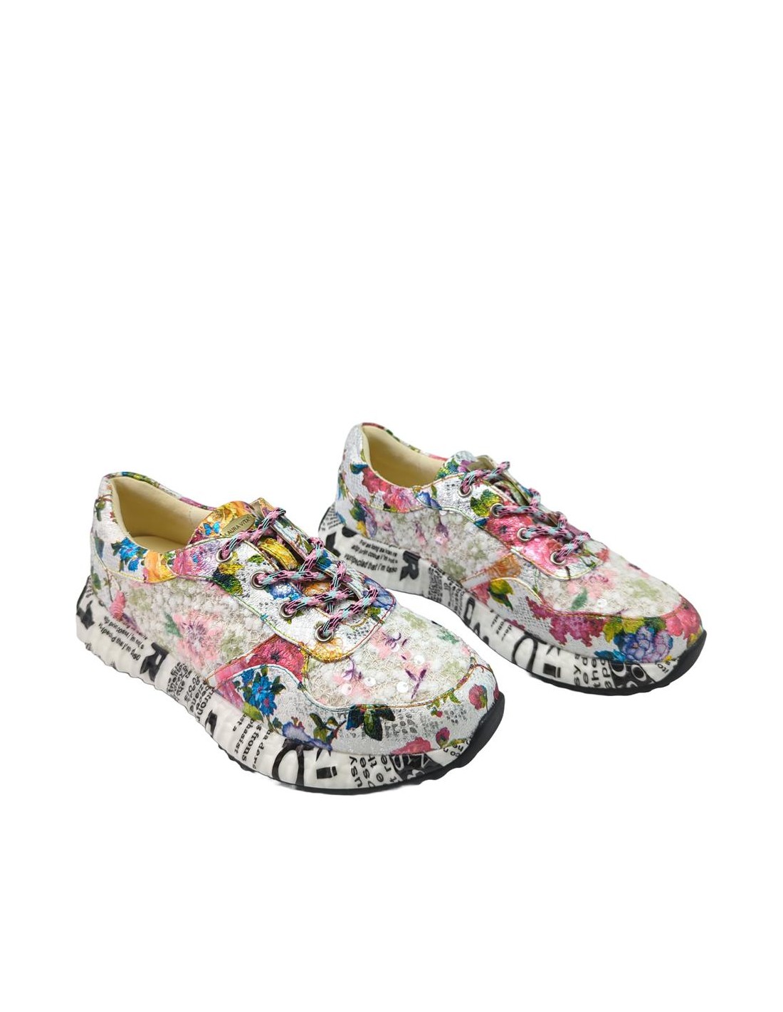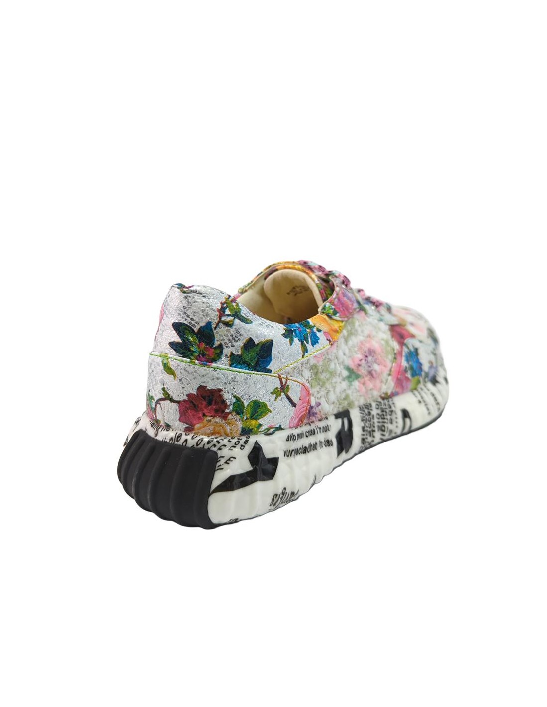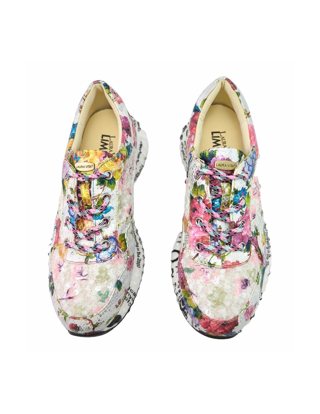 Descripción: Deportiva mujer Laura Vita BURTON-05 en piel con motivos florales sobre tejido blanco. Esta marca ofrece originalidad inspirada en la naturaleza y las artes, colorido nuevo cada temporada y comodidad.
