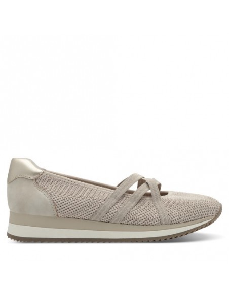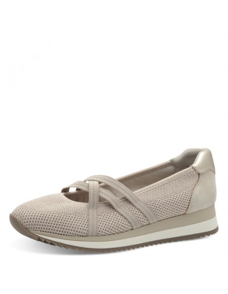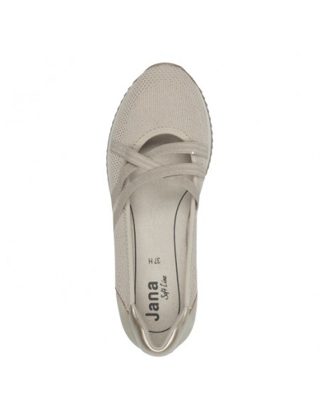 Descripción: Bailarina deportiva mujer con CERTIFICADO VEGANO 22172 de Jana en suave tejido beig. Ajuste en el empeine con tiras elásticas. Plantilla acolchada. Ligera y cómoda cuña flexible y antideslizante.