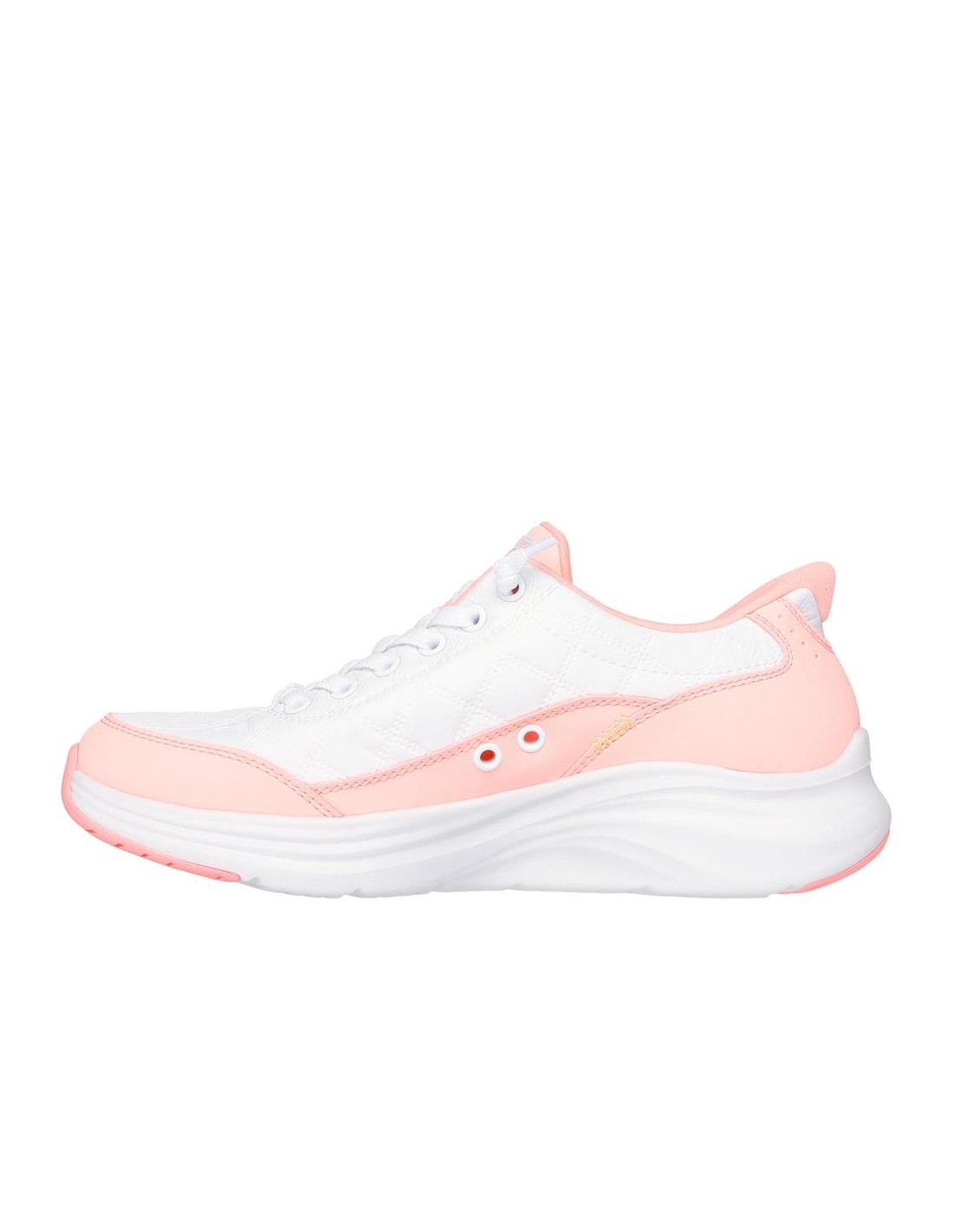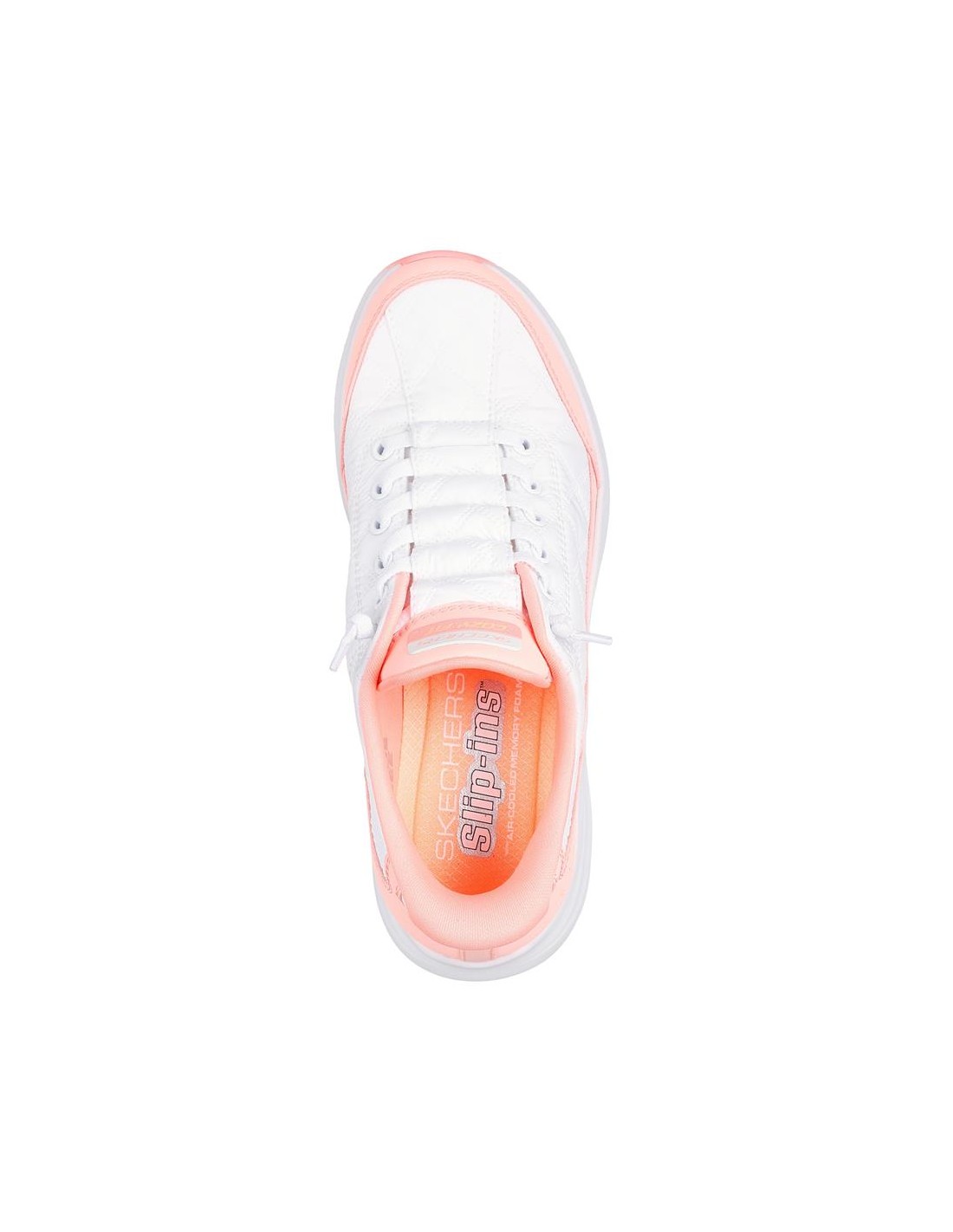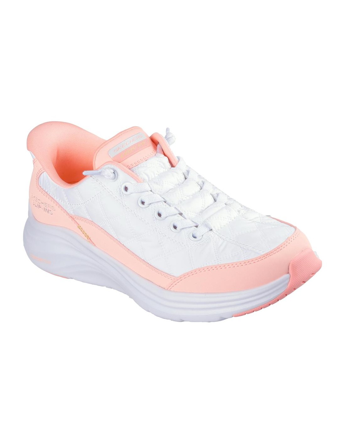 Descripción: Deportiva mujer Skechers SLIP-INS VAPOR FOAM de suave malla blanca texturizada con refuerzos tono coral. Plantilla amortiguadora Air Coled Memory Foam. Piso ligero Vapore Lite. Sistema Heel Pillow para calzar sin manos.